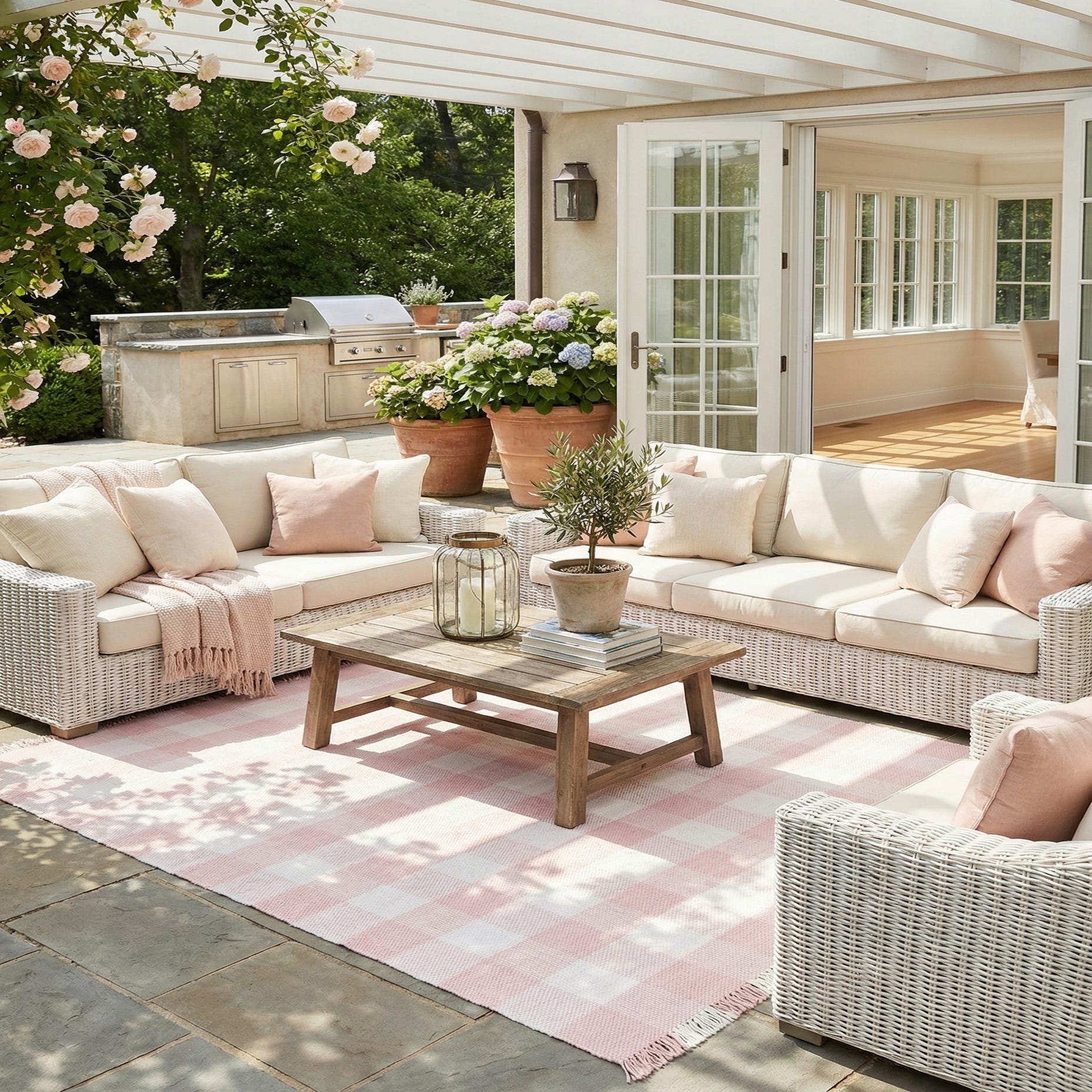 A soft pink background sets the stage for a large-scale plaid of ivory bands that cross to form a clean, classic checkered pattern. The flat-woven surface has a low profile and a subtly textured hand—you can feel the woven structure beneath your fingers while the short ivory fringe at each end adds a quiet, handcrafted touch. The overall look is casual and refined, with the pink and ivory palette keeping the design light and approachable.