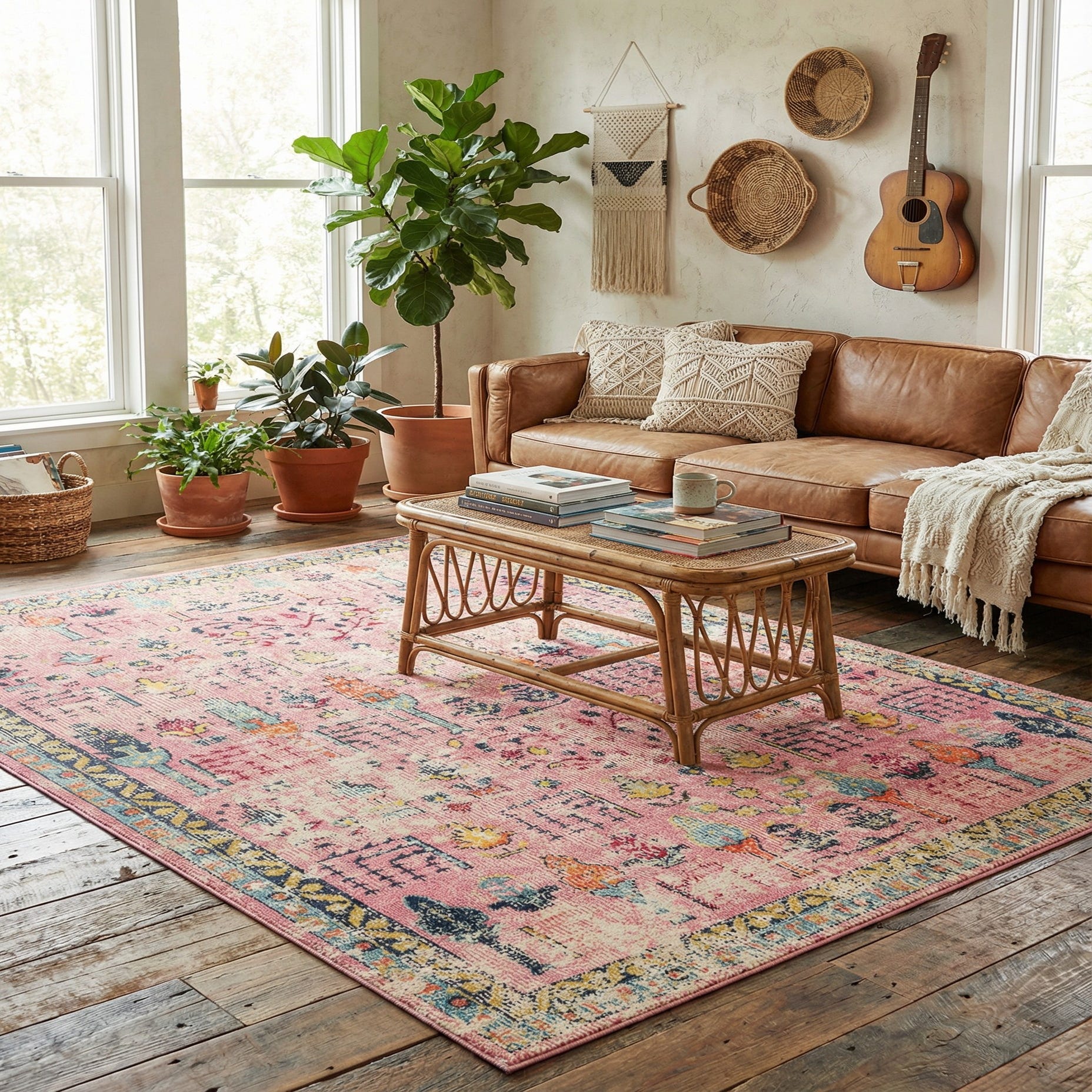 This lively palette and classic-meets-boho motif works well in a variety of settings: place it under a coffee table to warm a neutral living room, layer it in a casual dining area with light wood furniture, or use it to bring color and personality to a bedroom or home office. Pair with navy upholstery and gold or brass accents to echo the border, add olive and teal throw pillows for contrast, or compose a bright, eclectic scheme with mixed patterns and natural textures for a relaxed, collected look.