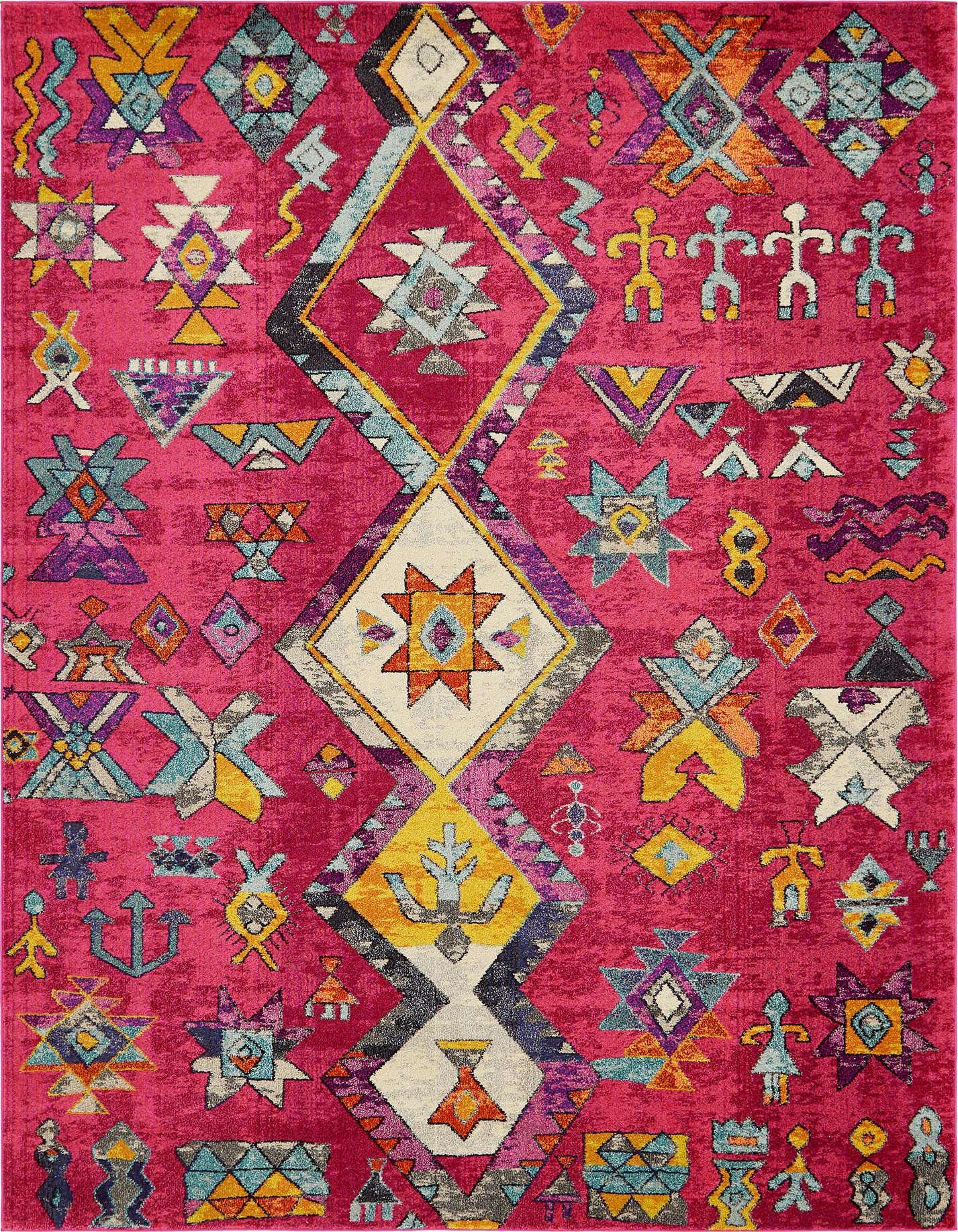 Primary color is Pink. Colors in this rug include: Pink, Black, Blue, Burgundy, Gray, Ivory, Orange, Turquoise, Yellow, Violet.