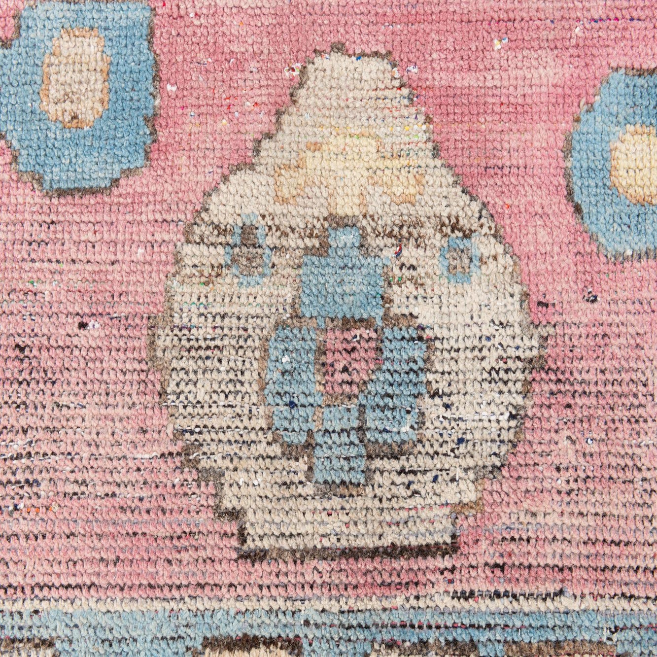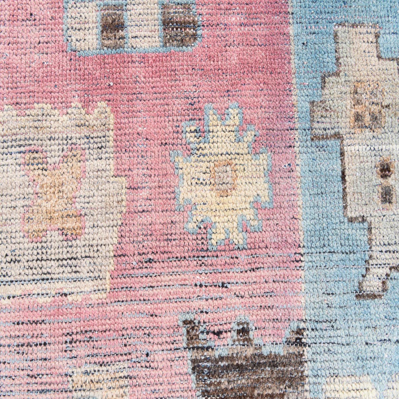 Primary color is Pink. Colors in this rug include: Pink, Brown, Light Blue, Light Brown, Ivory.