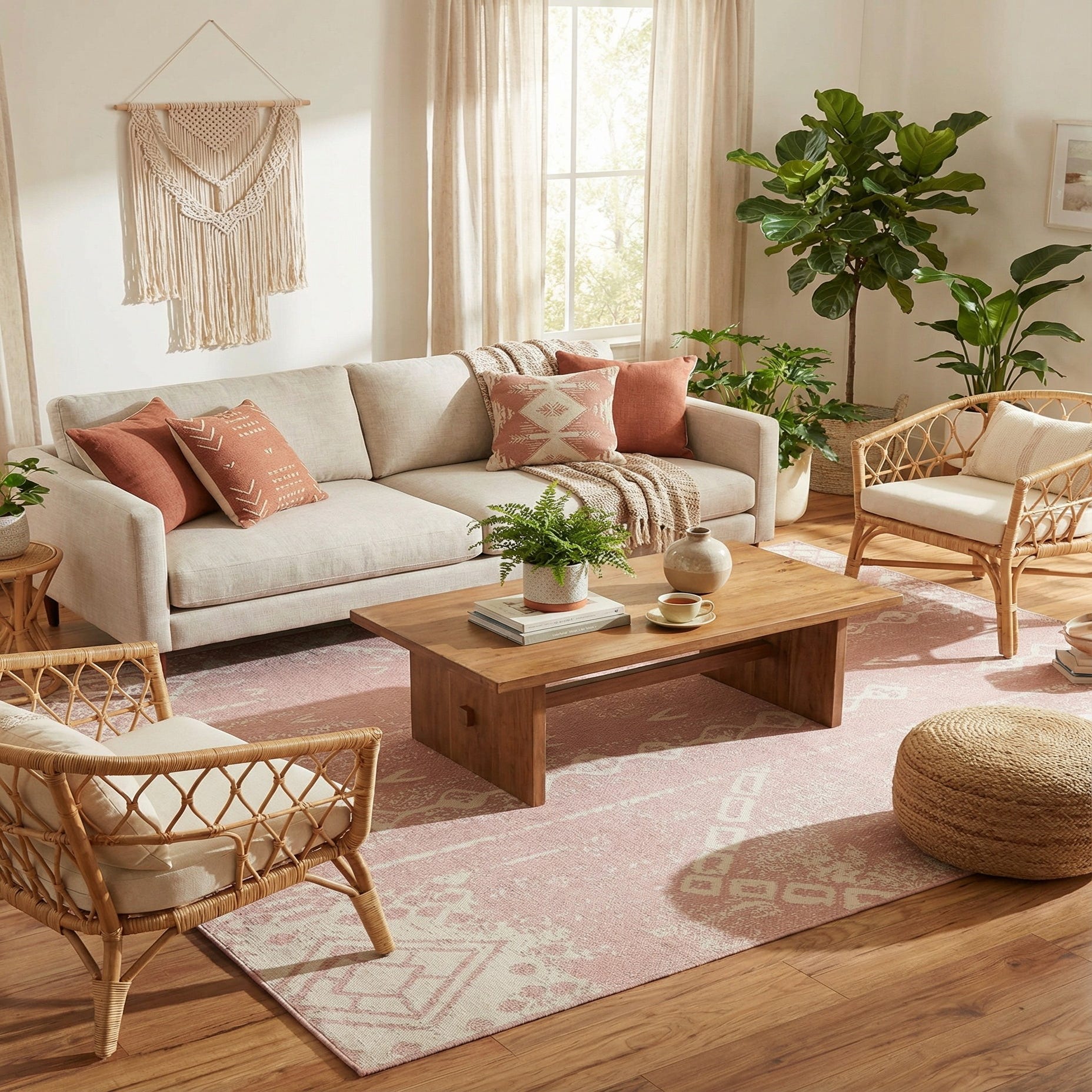 This rug works well on a covered patio or sunroom as a soft, colorful base for wicker or teak seating, and it pairs easily with light linen cushions and rattan accents. Inside, place it under a coffee table in a casual living room, in a nursery for a soothing pop of color, or layered beneath a bed in a coastal or contemporary bohemian scheme to soften hardwood or tile. The pink and ivory palette complements warm neutrals, pale wood tones, and soft metallic finishes.