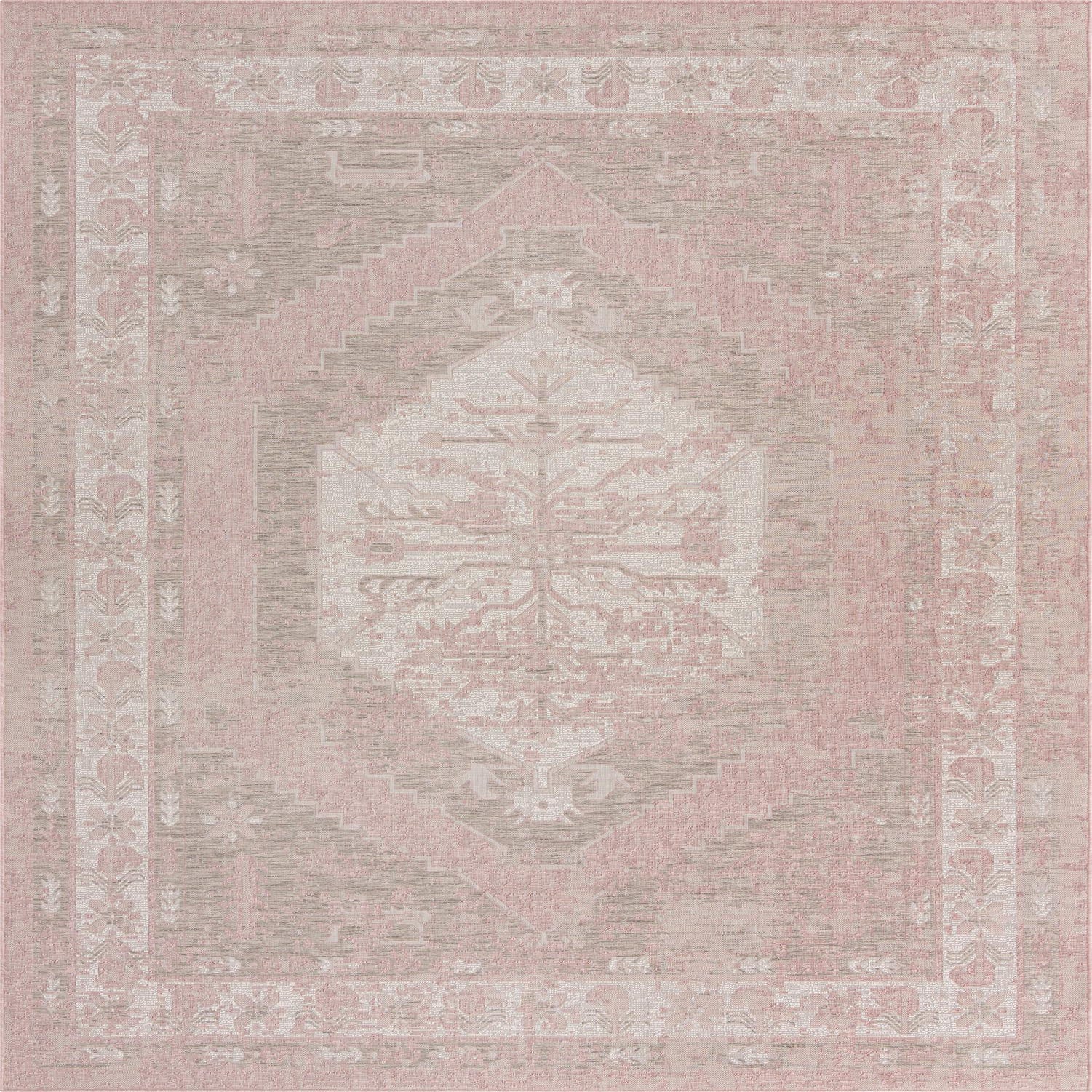 This 9x12 piece from our Outdoor Traditional collection features a timeless pattern that combines both classic and contemporary style. The machine-woven 100% polypropylene textile ensures durability and ease of care. The rug's dominant pink background is complemented by accents of ivory and gray, creating a soft yet sophisticated palette that can enhance the ambiance of a space.