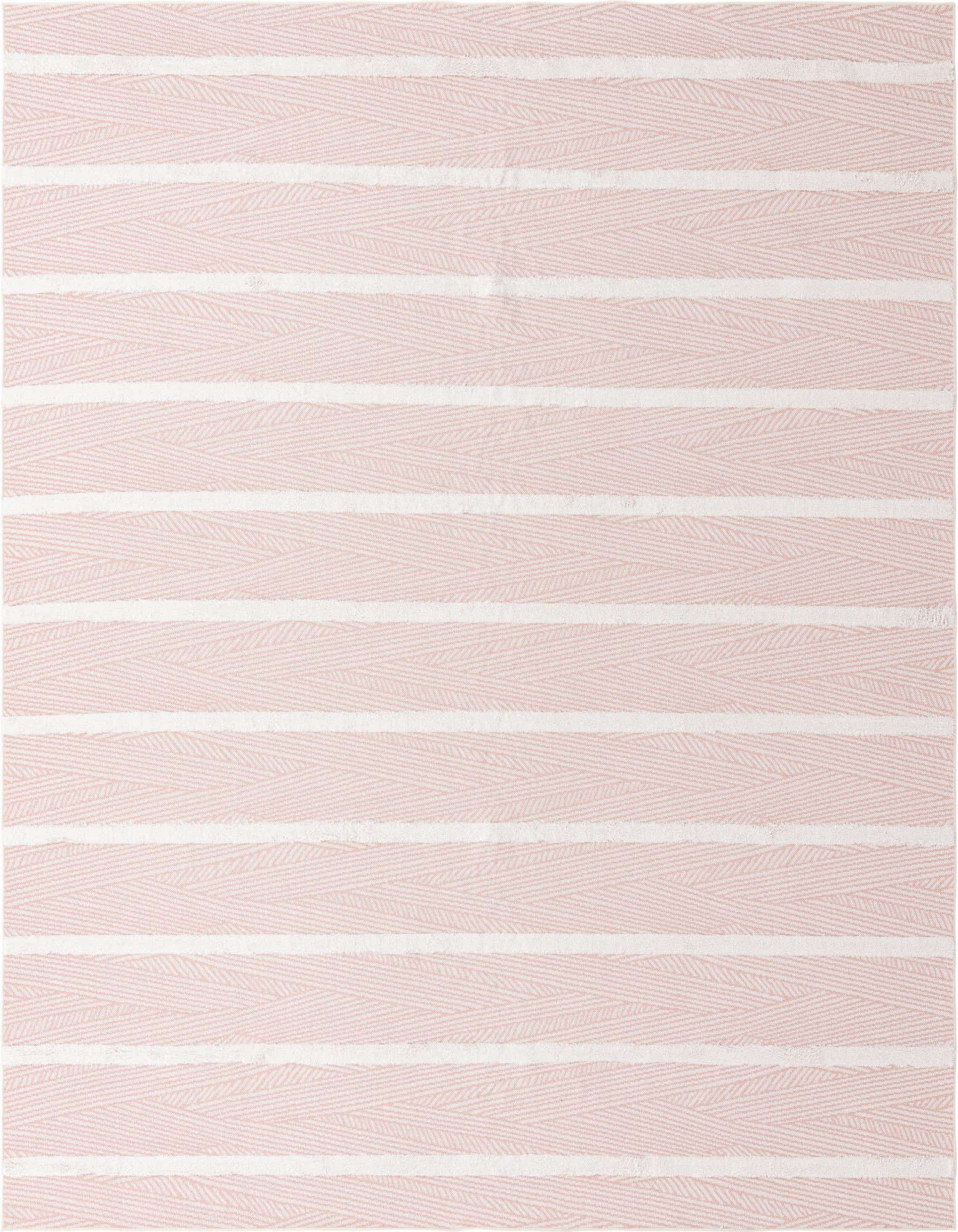 A soft pink field is accented by evenly spaced ivory bands that run horizontally across the weave, creating a calm, striped pattern with subtle movement. The pink areas carry a fine, chevron-like ribbing that gives the surface a gentle linear texture, while the ivory stripes sit slightly raised for a tactile contrast you can feel underfoot. Machine made from 100% cotton, the flatwoven construction has a low profile and a comfortable, natural hand.