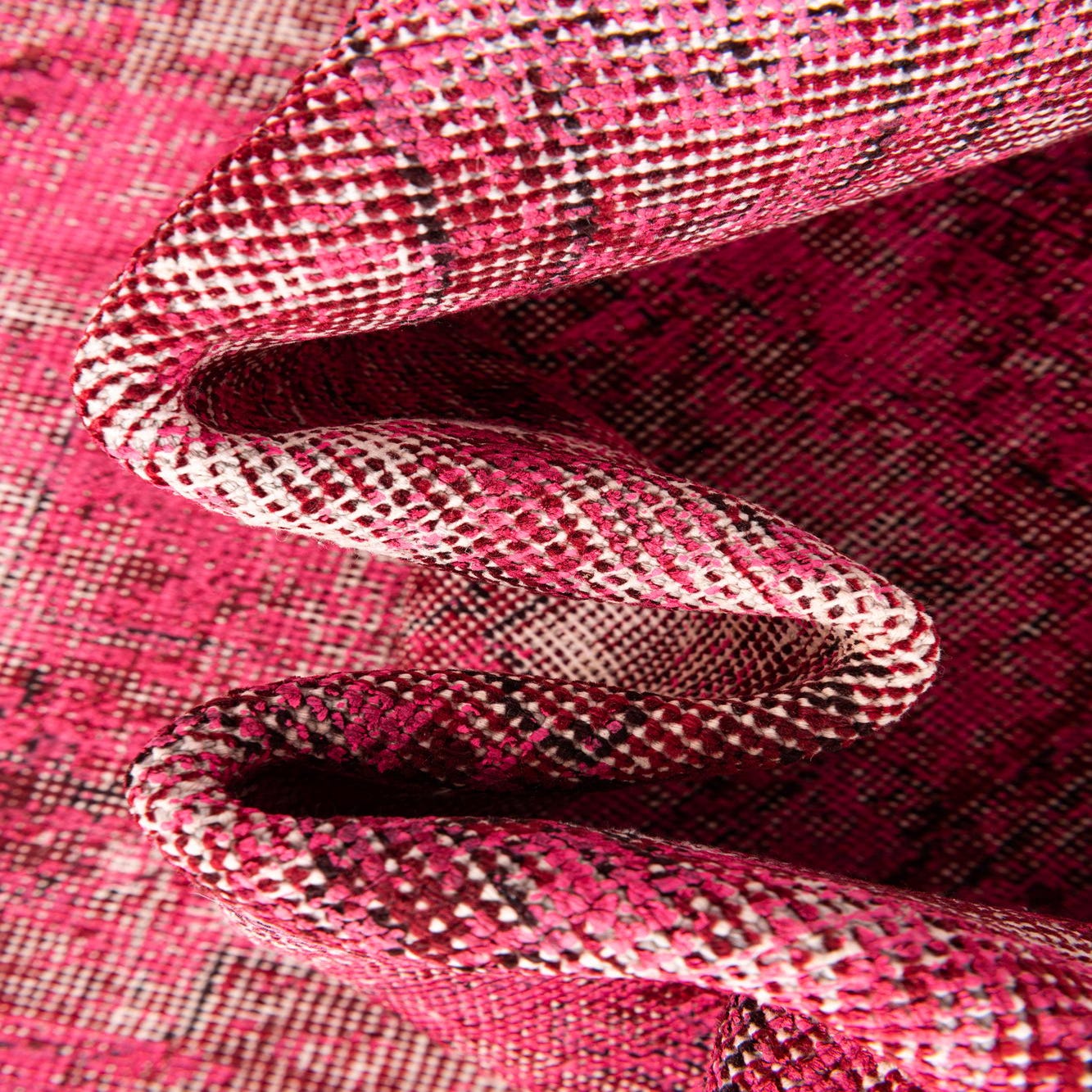 This Ultra Vintage collection rug is a hand-knotted piece, crafted with care from 100% wool, offering both durability and a soft, welcoming texture underfoot. Measuring 9x12, this rug presents a modern interpretation of traditional design through its overdyed and distressed pattern. The rug showcases a harmonious blend of colors, including pink as the dominant background hue, complemented by accents of red, ivory, and black, which come together to create a visually striking yet balanced aesthetic.