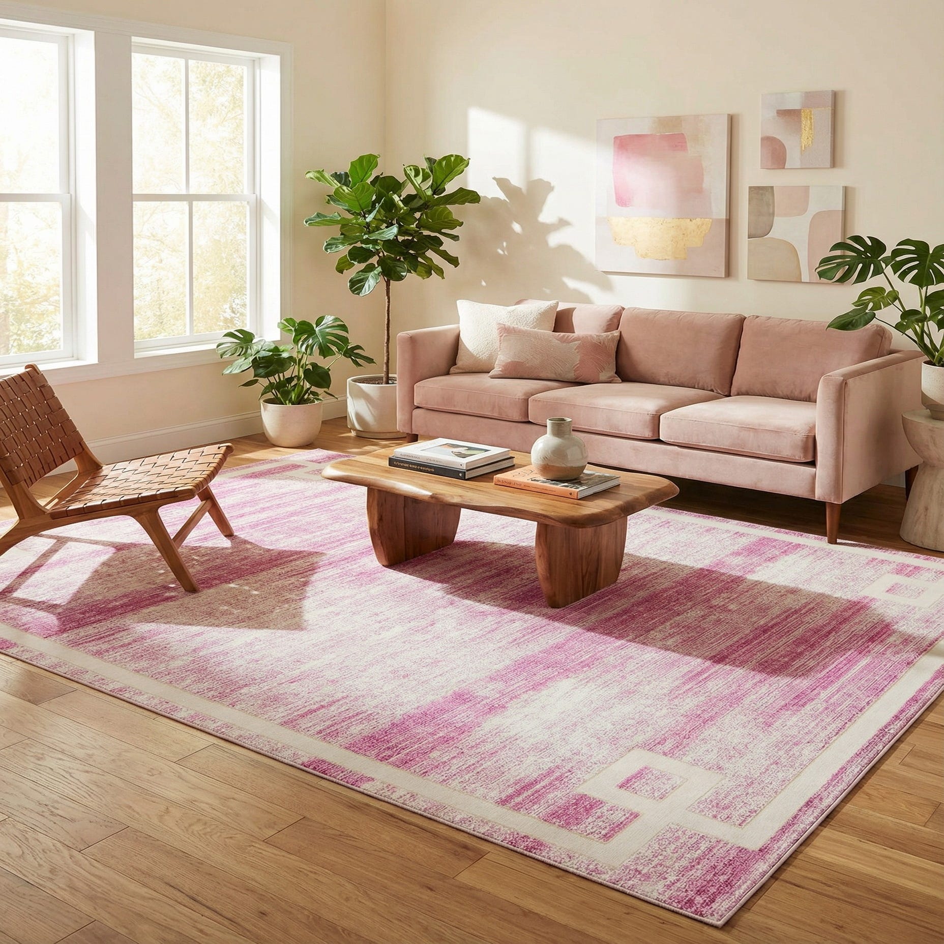 A soft pink background sets the tone, washed with ivory highlights that create a gently worn, strié effect across the field. Faint medallion echoes and horizontal banding give the surface subtle depth, while a crisp ivory linear border with squared corner motifs adds a modern geometric frame. Machine-made from 70% polypropylene and 30% polyester, the rug has a low-profile pile with a smooth, slightly silky hand that feels pleasant beneath your feet and lays flat for easy layering.