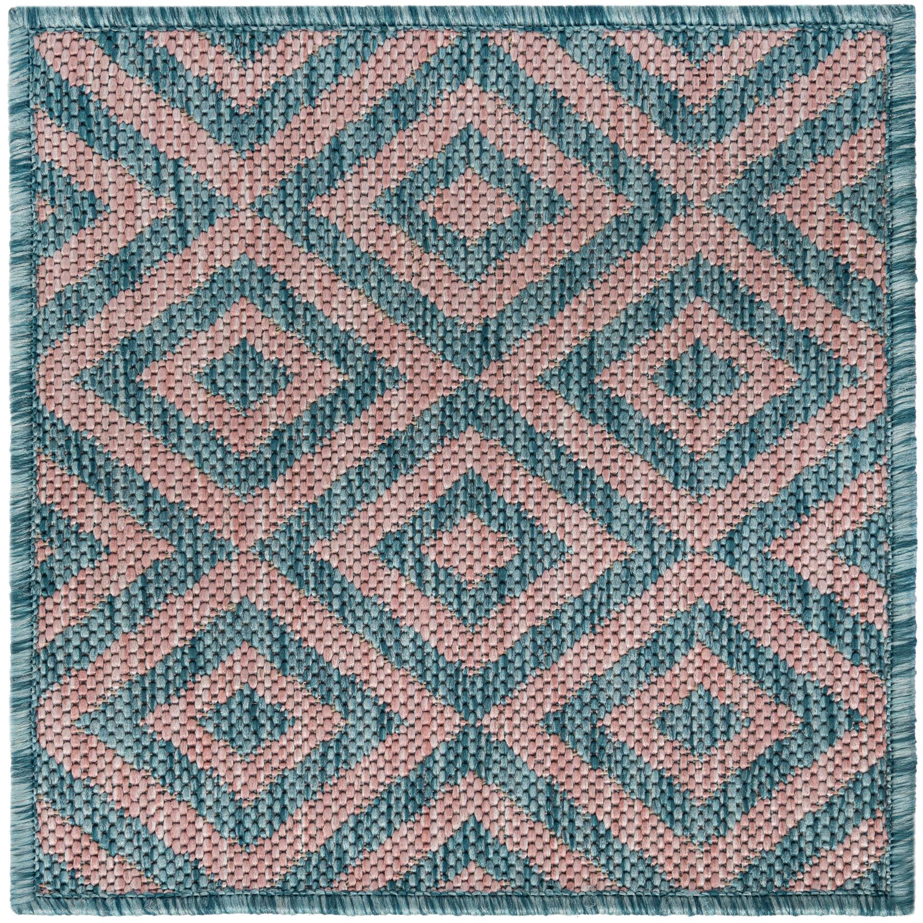 A 1' 2 x 1' 4 square Pink and Aqua Jill Zarin Outdoor rug with a modern trellis pattern, suitable for indoor or outdoor use.