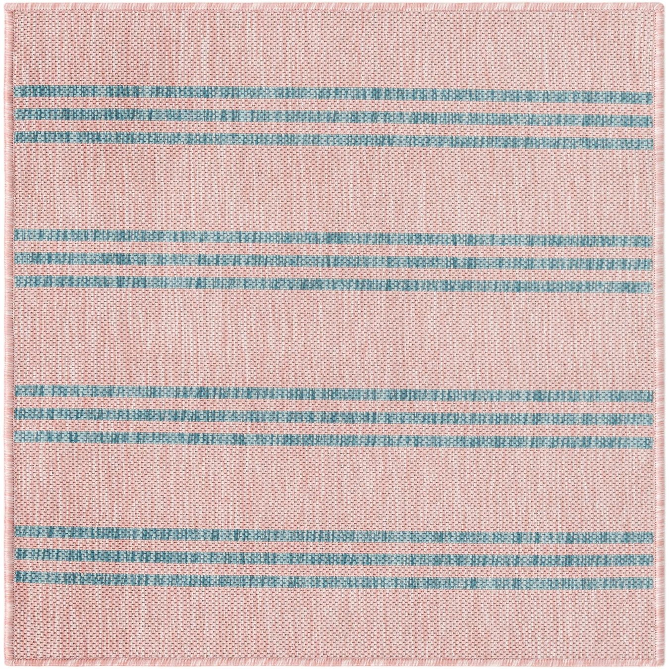 A 2x3 rectangular Jill Zarin Outdoor rug featuring a pink background with horizontal aqua stripes, suitable for indoor or outdoor spaces.