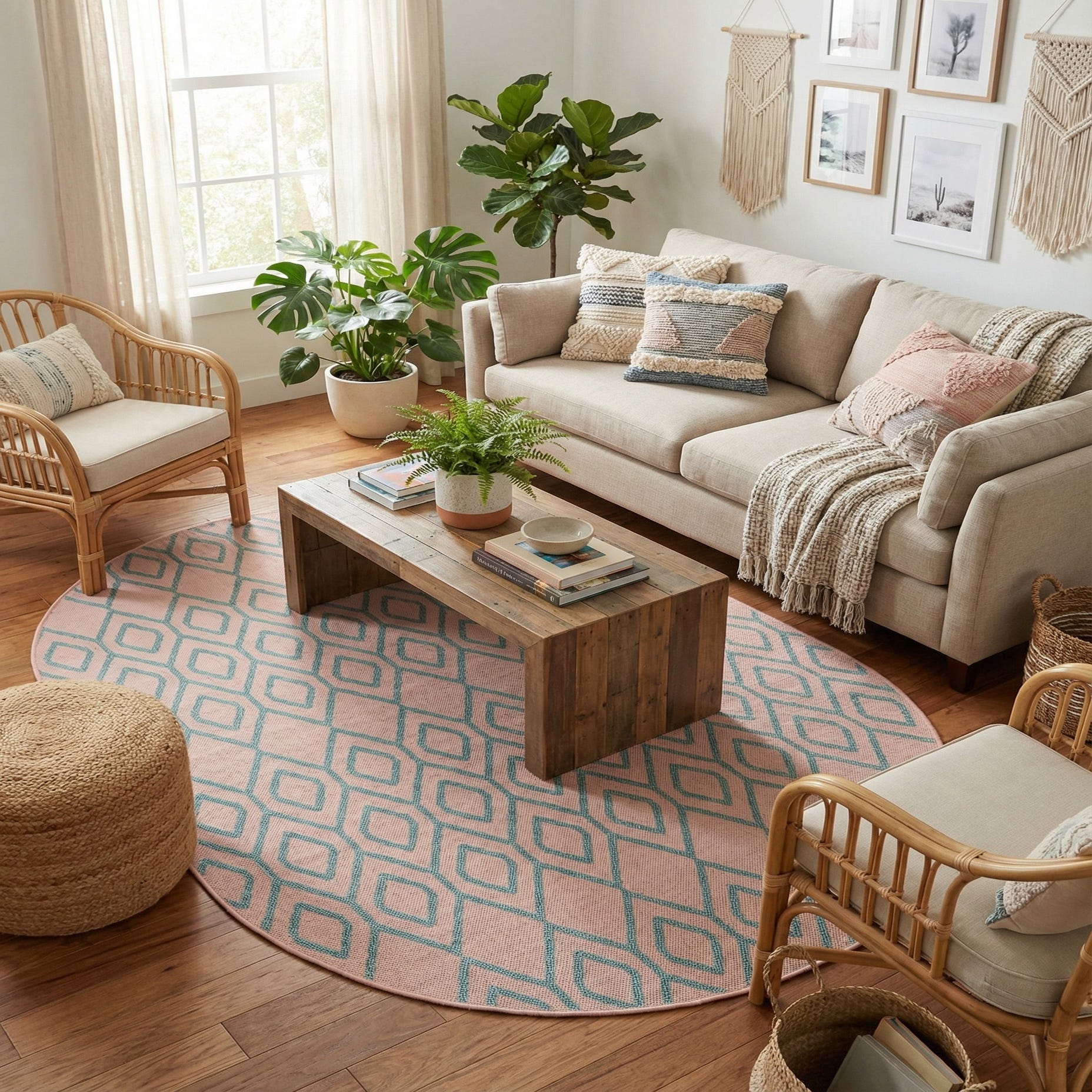 An oval 5'3" x 8'0" Jill Zarin Outdoor rug in pink with an aqua modern trellis pattern, suitable for indoor or outdoor use.