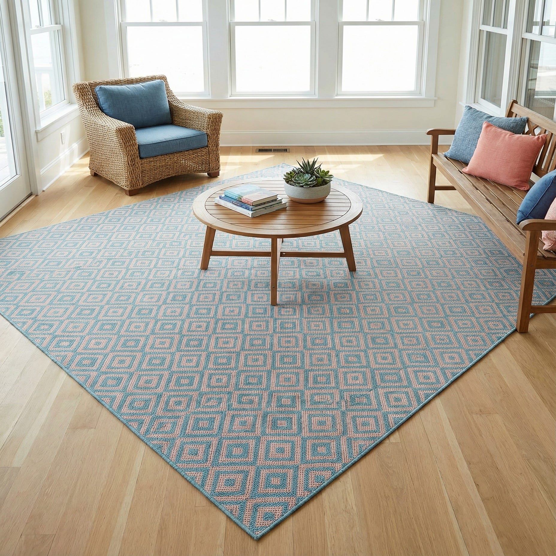 A compact, repeating diamond lattice gives this machine-made rug a structured, modern look. Aqua geometric motifs are woven against a soft pink ground so the color interplay reads as fresh and lively without overwhelming a space. Made from 100% polypropylene in a flatweave construction, the surface is low-profile and tightly woven—it has a slightly textured, firm hand that lays flat and feels clean underfoot.