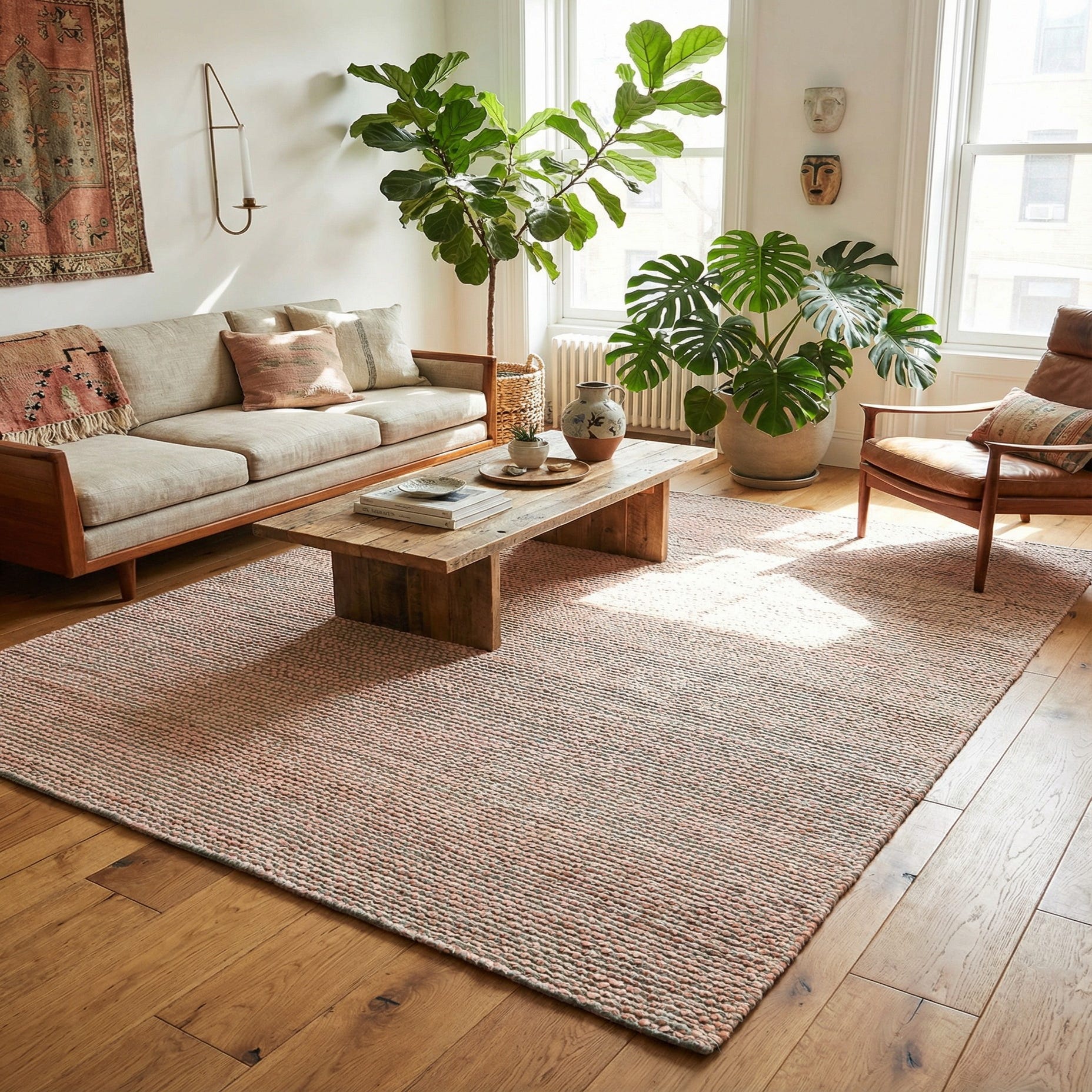 Hand woven from 60% jute and 40% wool, the rug has a low-profile, flatwoven texture with a slightly nubby hand—wool brings a soft touch underfoot while jute provides a structured, tactile feel. Place it to anchor a living area or beneath a sofa for a layered, relaxed look, use it in a bedroom to soften hardwood floors, or set it under a dining table in an open-plan space for subtle warmth. It pairs beautifully with light wood furniture, woven accents like rattan or wicker, soft linens in neutrals and pastels, or simple metal finishes for a balanced, lived-in aesthetic.