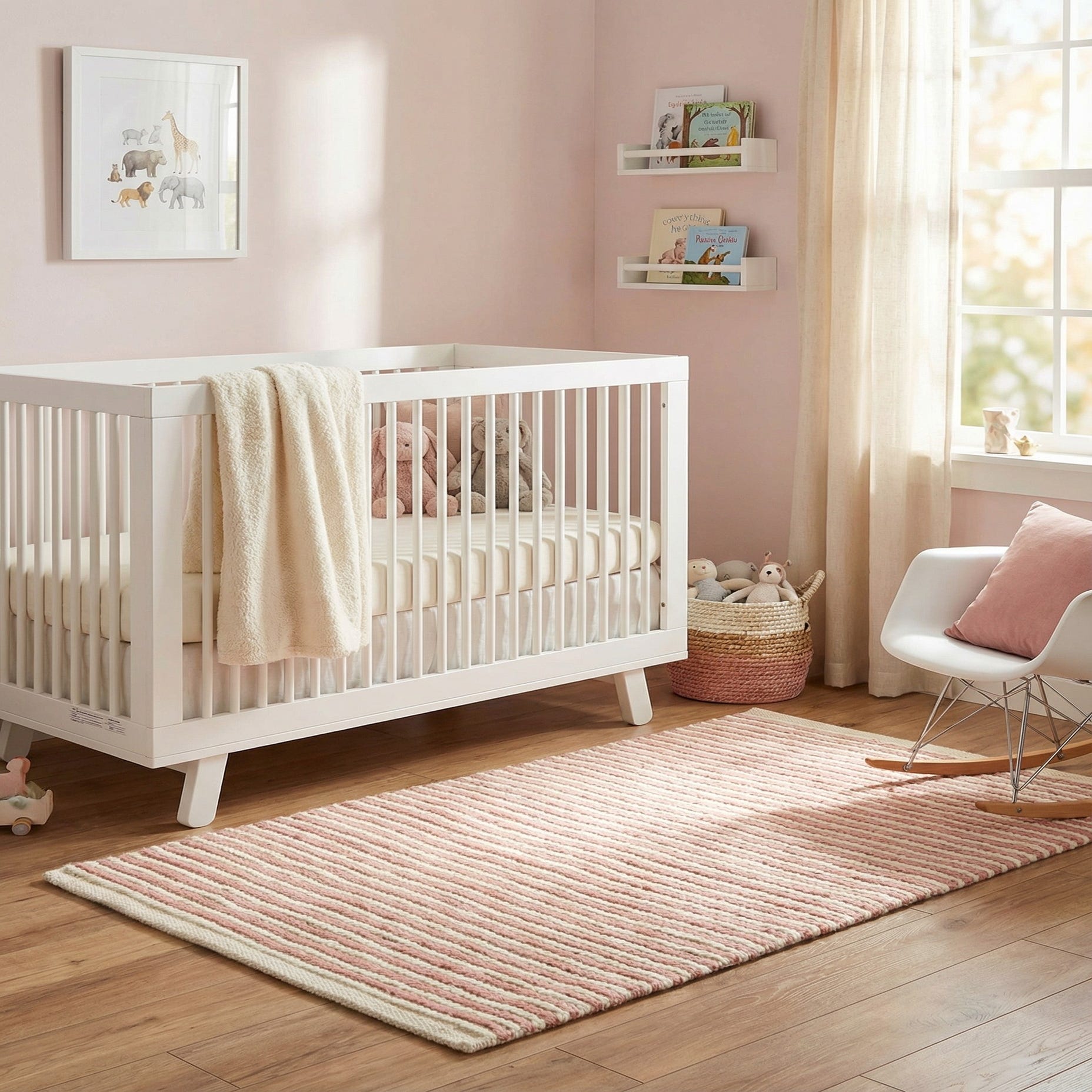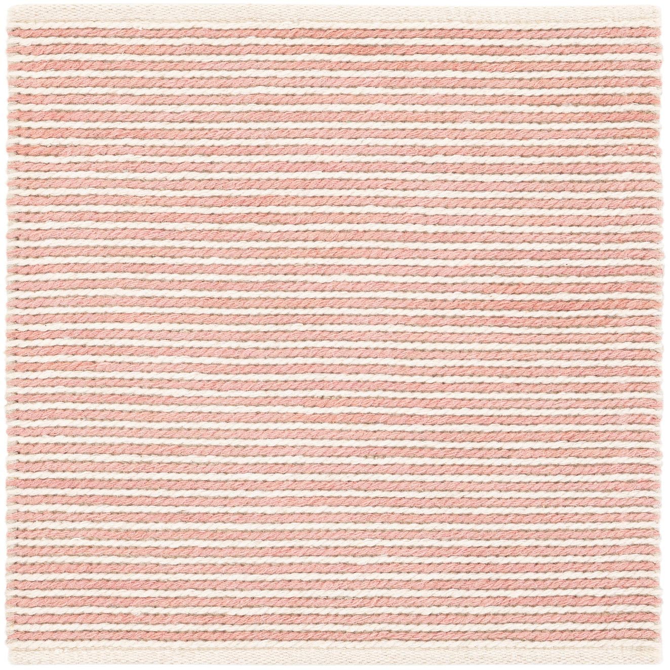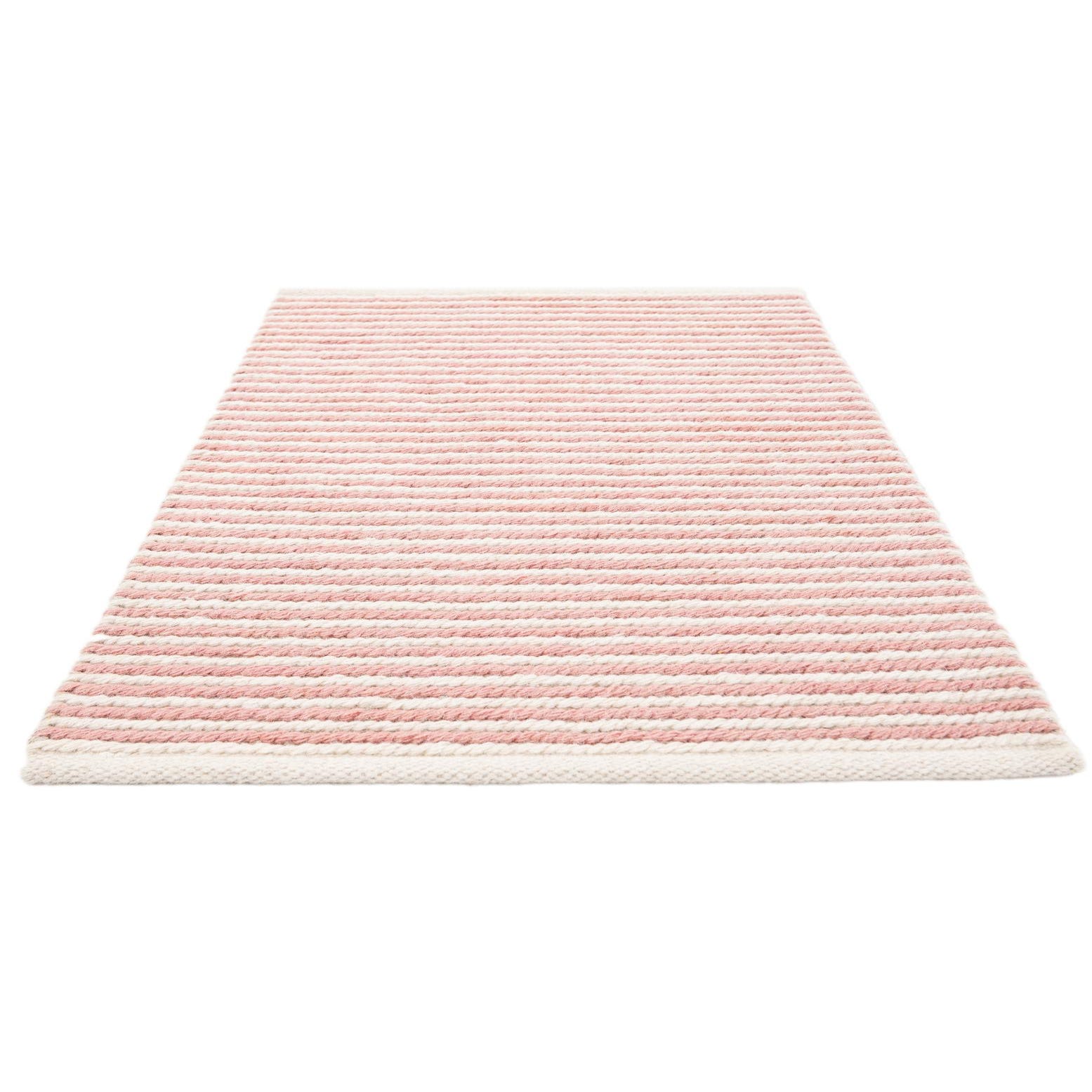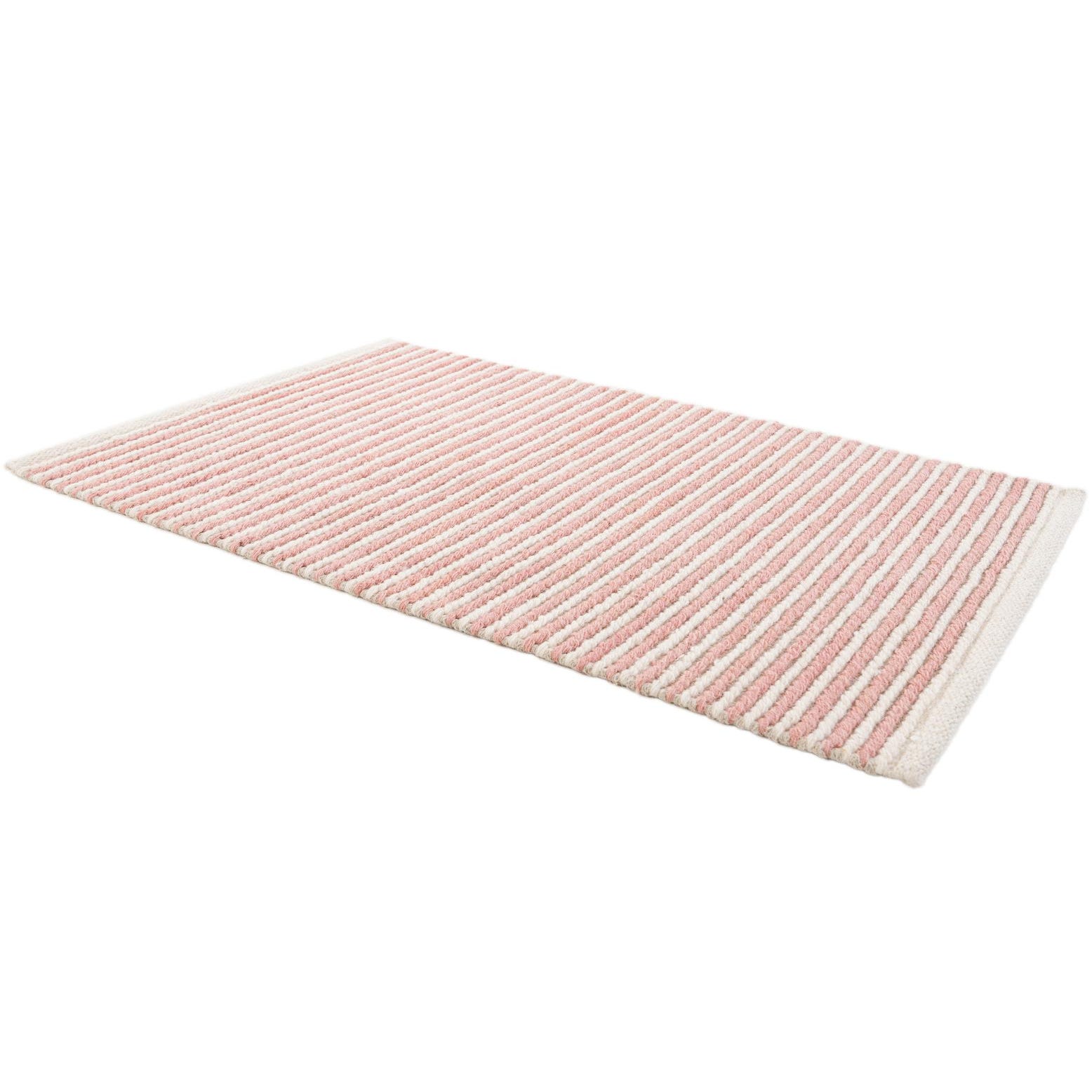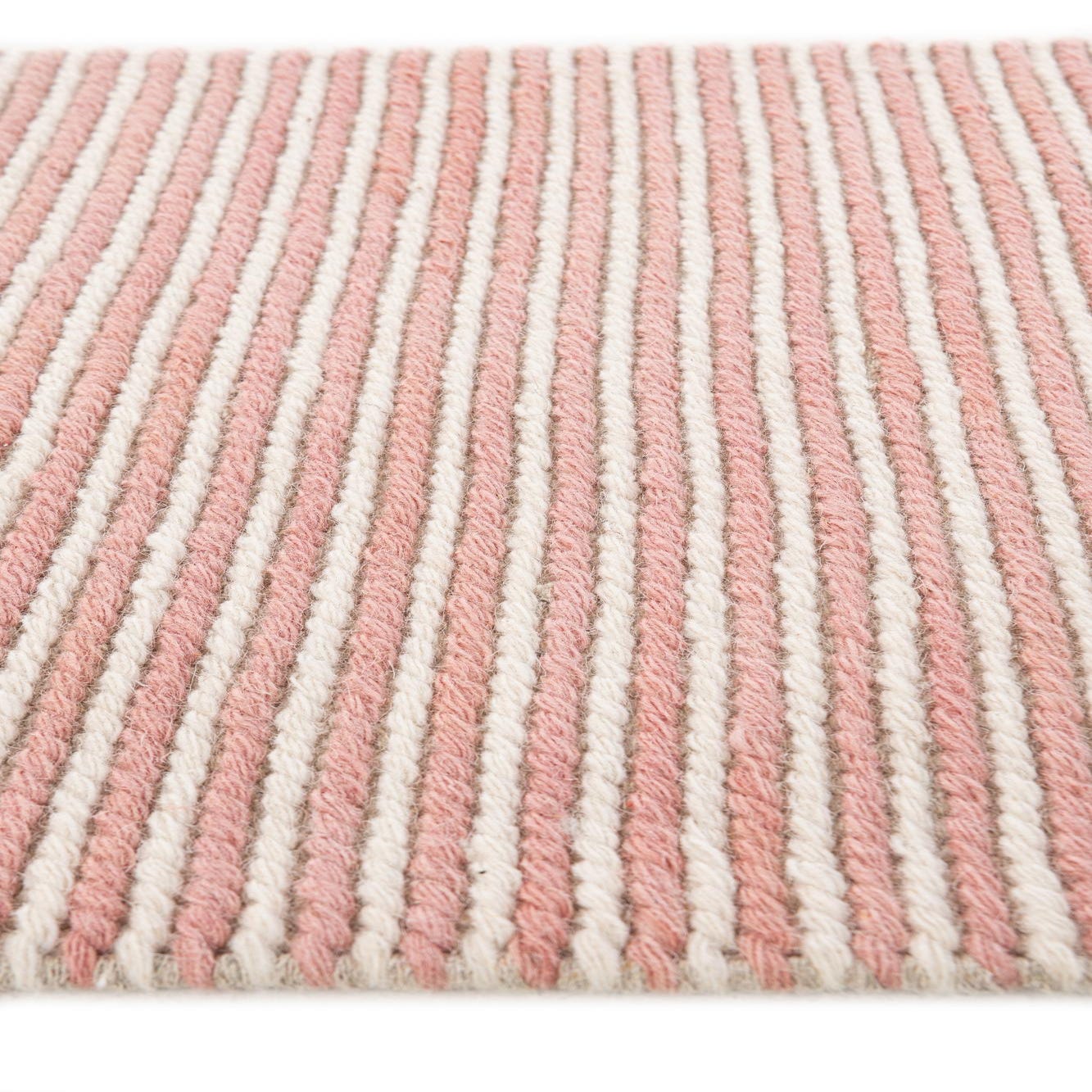 A 2x3 rectangular modern rug with alternating horizontal stripes of soft pink and off-white wool and cotton.