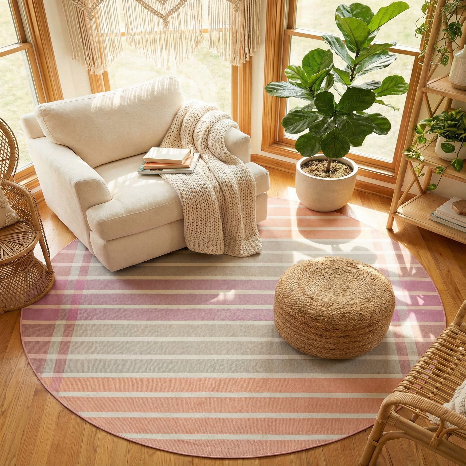 A clean, tailored stripe pattern defines this round outdoor rug, with a blended pink-and-lavender ground punctuated by crisp ivory lines and brighter bands of orange and red. The vertical stripes give the piece a structured, contemporary look while subtle crossbands at the edges create a faint plaid effect that adds visual interest without overwhelming the design. Machine-made from 100% polypropylene, the rug has a low-profile, tightly woven texture that feels smooth underfoot yet retains a slight woven grain you can sense when you run your hand across it.