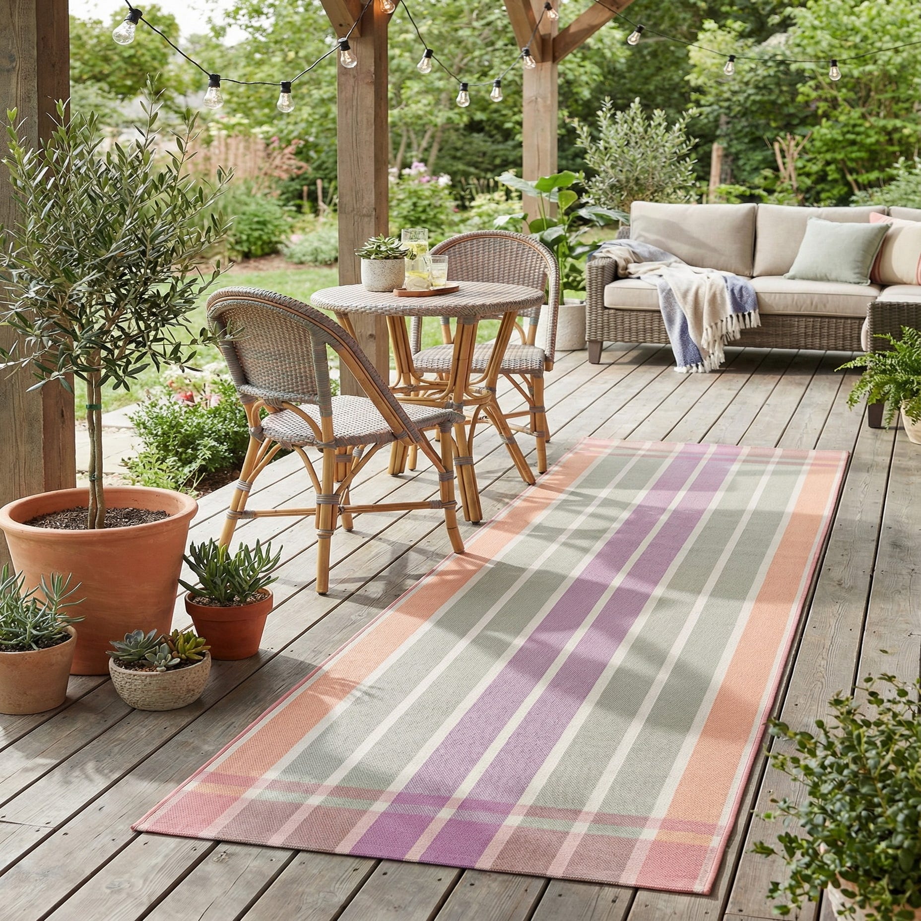 A 10 ft runner rug featuring modern vertical stripes in shades of pink, purple, and gray, suitable for a hallway or patio.