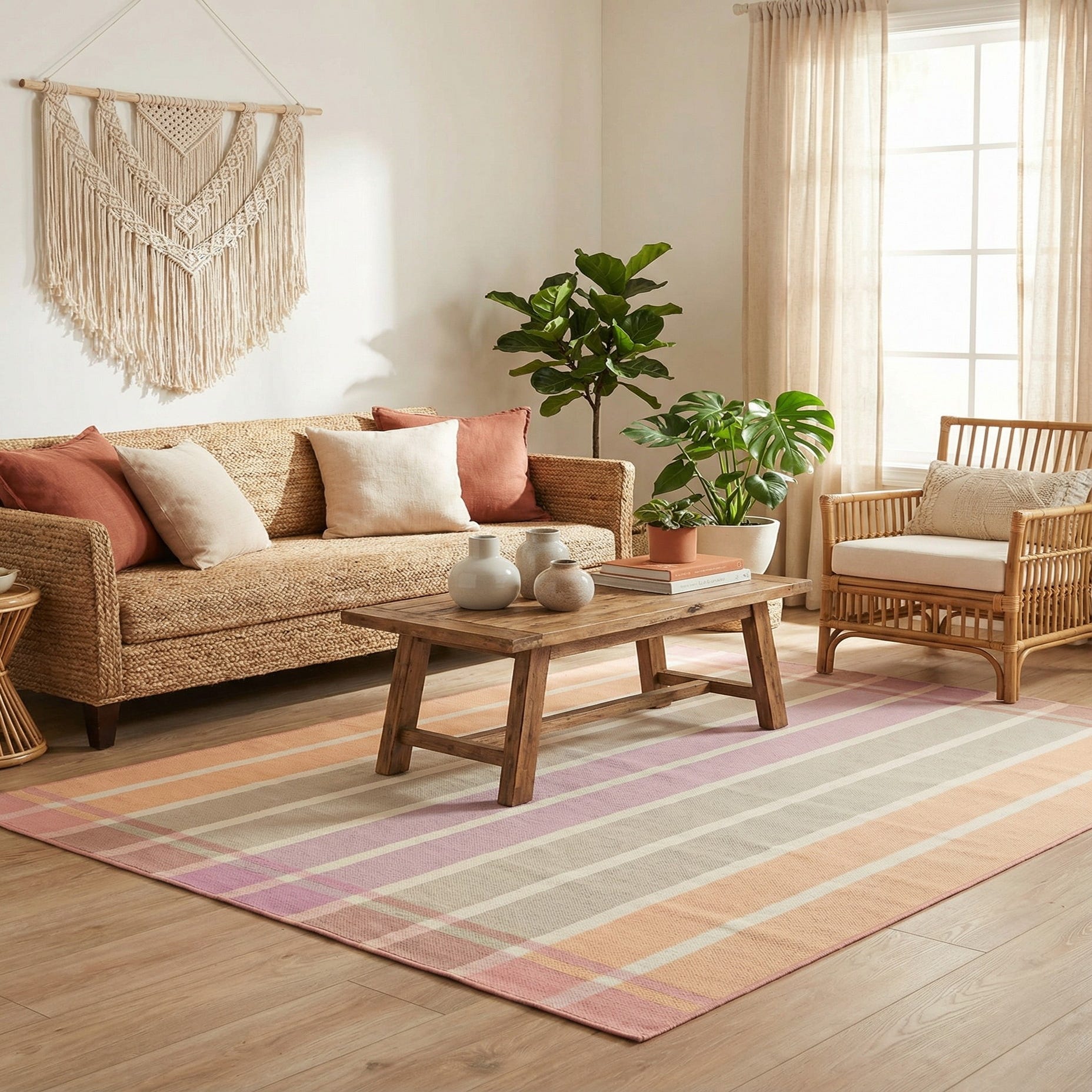 This colorway and pattern work well in outdoor living areas and light-filled indoor rooms alike — try it beneath a bistro table on a covered patio, in a sunroom with wicker seating, or layered in a coastal or cottage-style living space. Pair it with light woods, white or ivory furnishings, and soft textiles in blush or lavender tones to reinforce the palette, or use it to introduce a gentle accent color in a modern, minimal scheme.