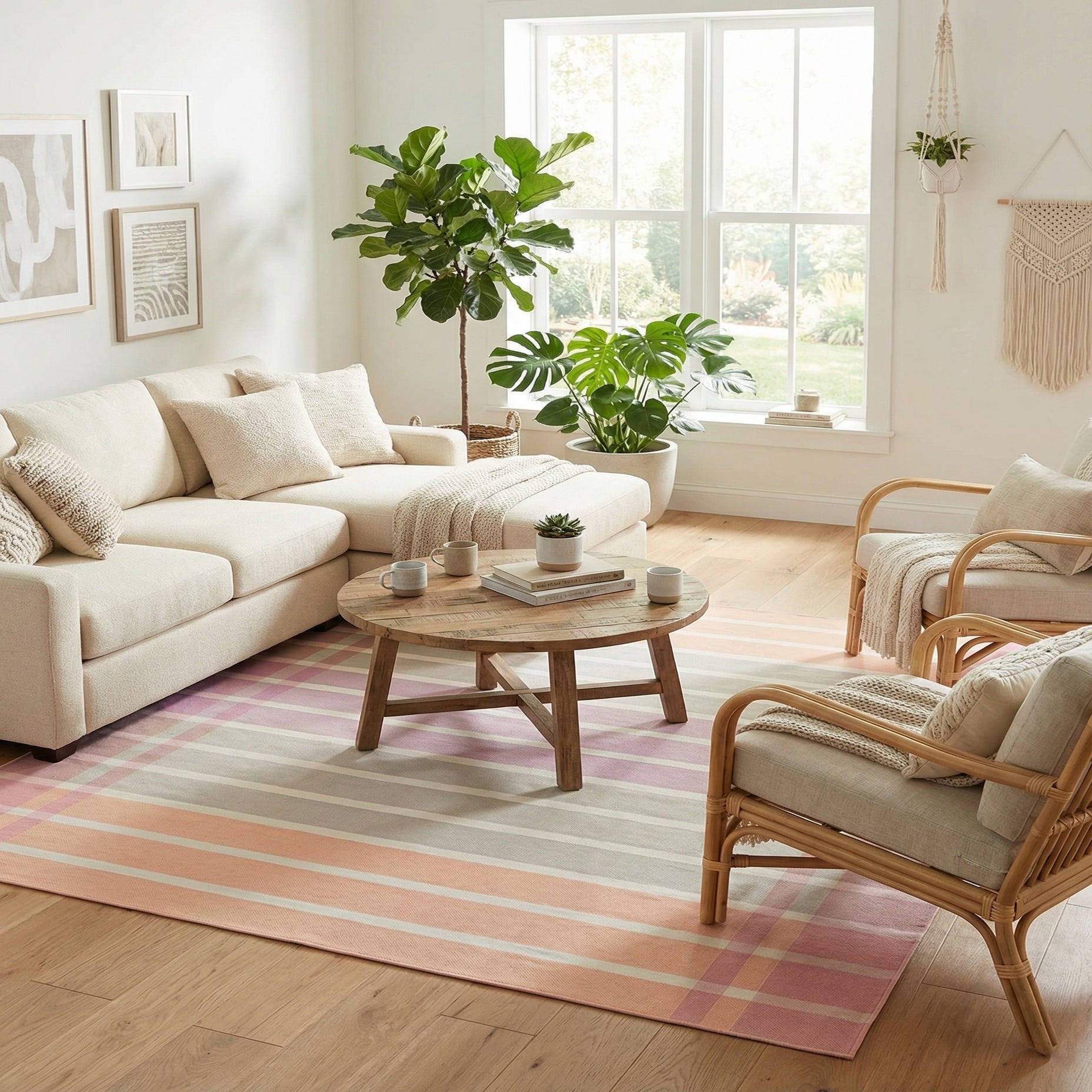 A square 7' 10 x 7' 10 modern stripe rug in shades of pink, purple, and peach, suitable for indoor or outdoor use.