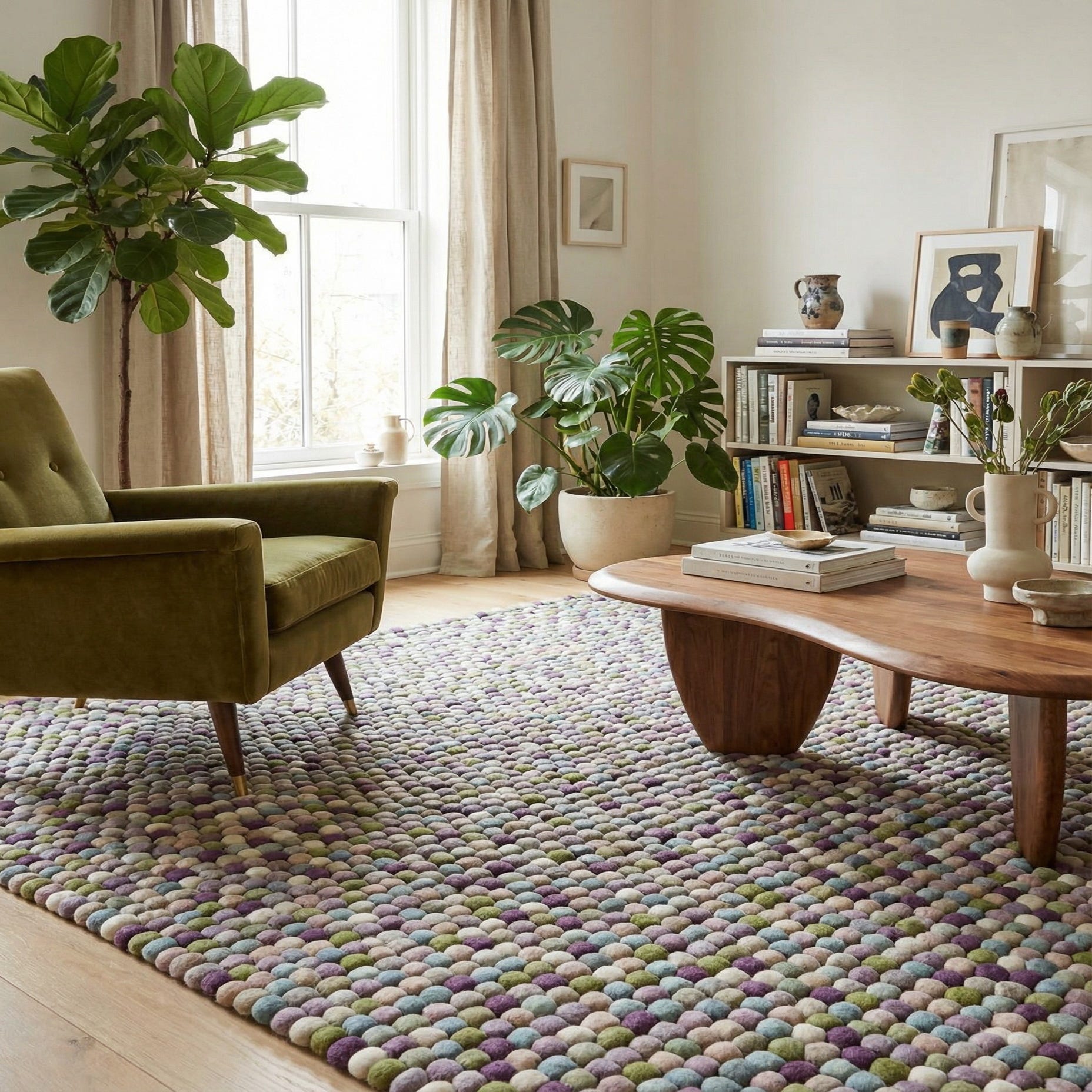 The texture is tactile and cushioned—each felted piece has a springy, slightly irregular quality underfoot that invites touch. Use this rug to add color and texture to a nursery or playroom, anchor a cozy reading nook with neutral seating and light wood tones, or layer it in a contemporary bohemian living area alongside woven throws and brass or matte black accents. It also works well beneath a low coffee table where the pattern can be appreciated up close.