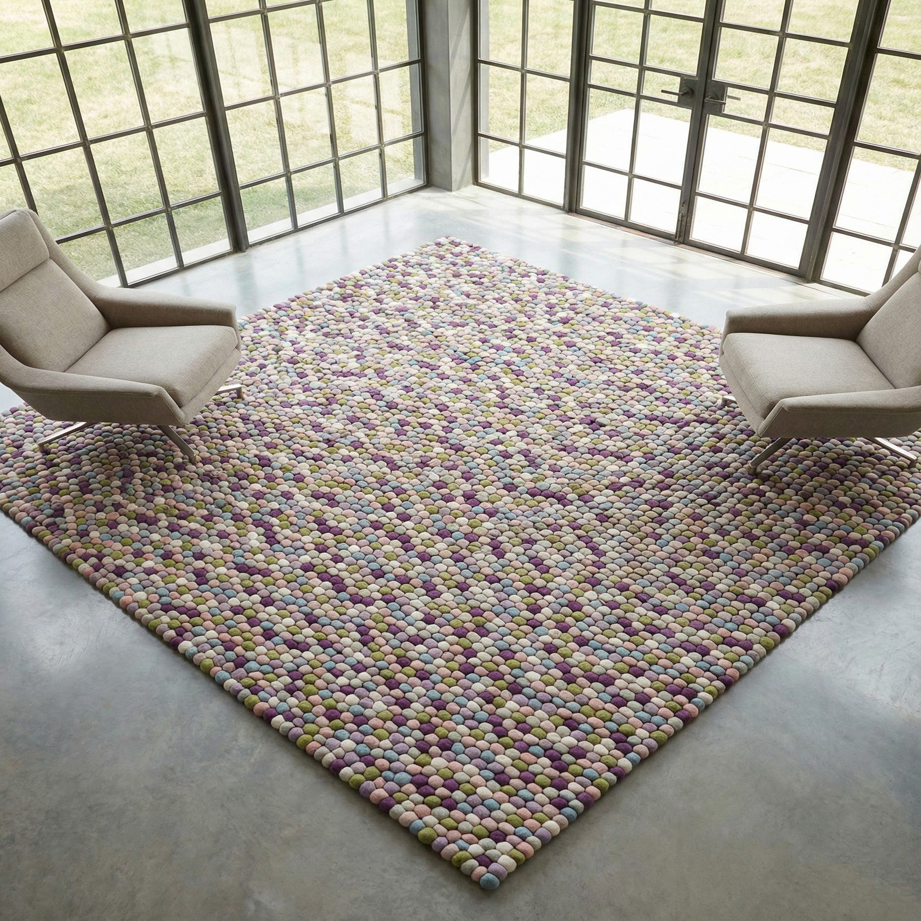 Hand-woven from 100% wool, this rug is made up of tightly packed felted wool spheres that form a dense, pebble-like mosaic across a pink-and-purple ground. The textured surface is tactile and slightly sculpted—soft to the touch yet structured—so the individual wool elements are perceptible beneath bare feet. A mix of ivory, olive, light blue and violet accents sits against the pink-and-purple background, giving the pattern a playful, multi-hued depth without overwhelming the overall harmony.