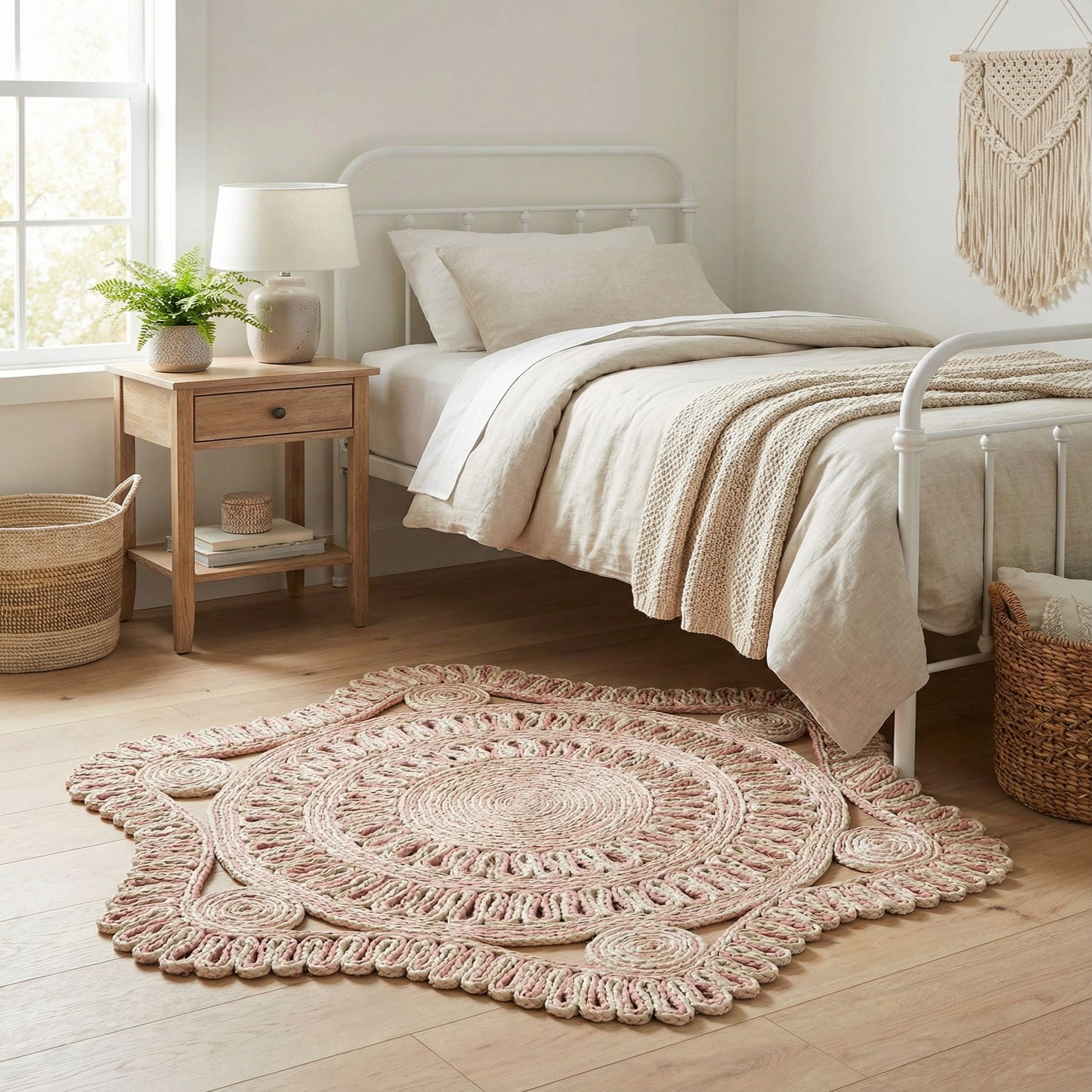 Its round shape and intricate braiding pattern lend a unique and contemporary look, suitable for accentuating a variety of interior styles. The contrasting braided border adds an additional layer of detail, enhancing the rug's overall aesthetic. Ideal for small spaces or as a focal point in a room, this rug complements Scandinavian, coastal, and bohemian decors, while also fitting beautifully in nurseries or whimsical, softly colored living areas. Its natural material and soft coloration make it a versatile choice for adding warmth and texture to your space.