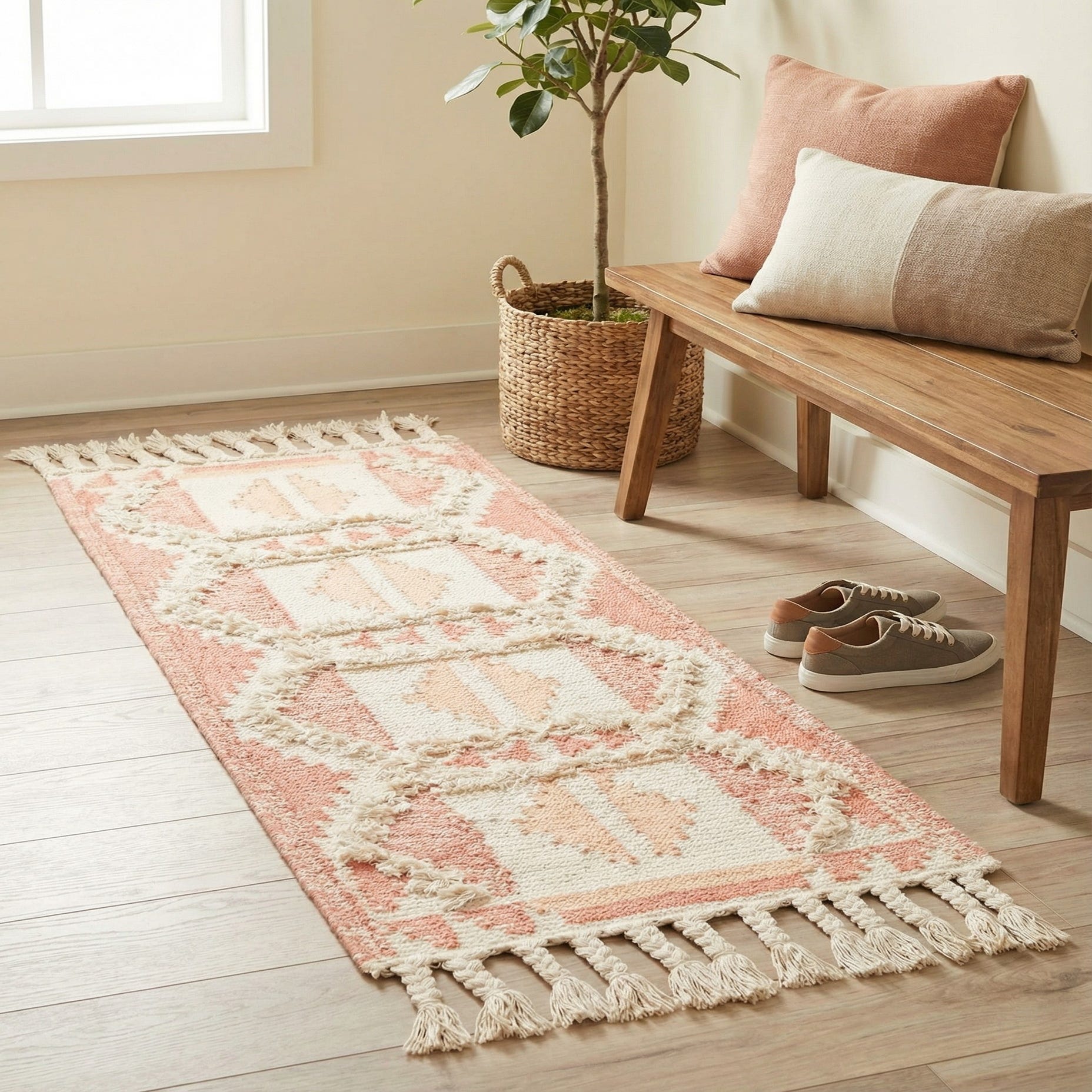 Hand woven of 100% wool, this runner blends a soft pink and white ground with warm peach and coral geometric motifs for a relaxed, textural look. A series of medallion shapes runs the length of the piece, framed by stepped borders and accented with raised, looped tufting that creates a subtle high-low texture you can feel beneath your feet. The wool pile has a gently cushioned hand while the braided tassel ends add a finished, tactile touch.
