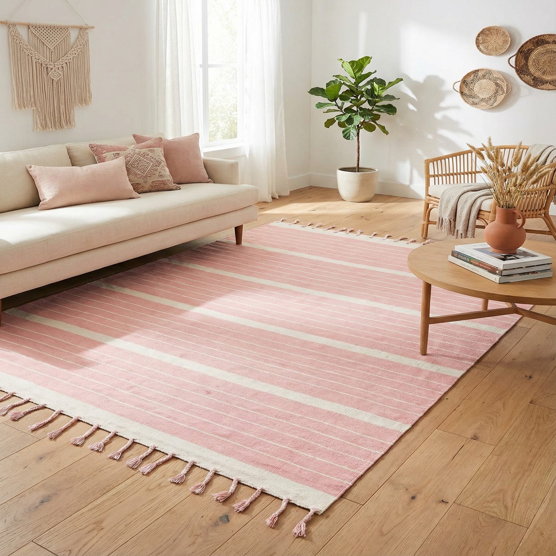 Hand woven of 100% cotton, this flatwoven rug shows a soft pink ground punctuated by crisp white pinstripes and broader white bands that run horizontally across the surface. Short knotted tassels finish both ends, adding a handcrafted touch. The weave sits low and firm underfoot, with a smooth, slightly textured hand that layers well over hard floors or natural fiber rugs.