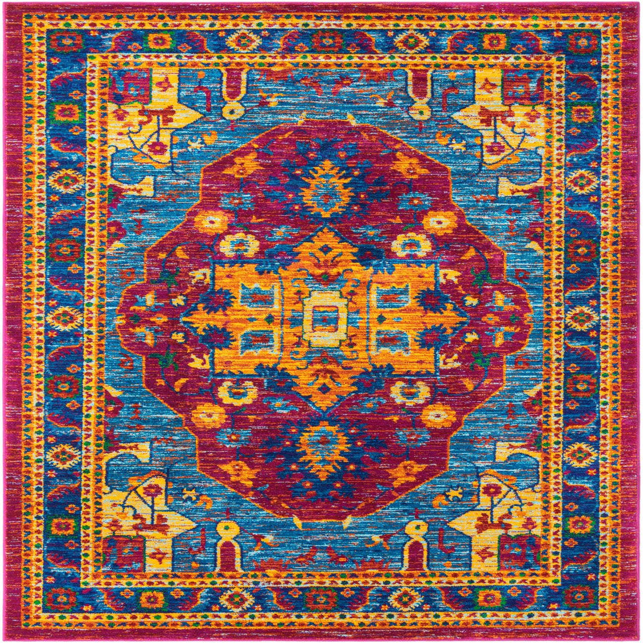 A vibrant 5x8 rectangular Calypso rug featuring a traditional medallion pattern in blues, pinks, and gold.