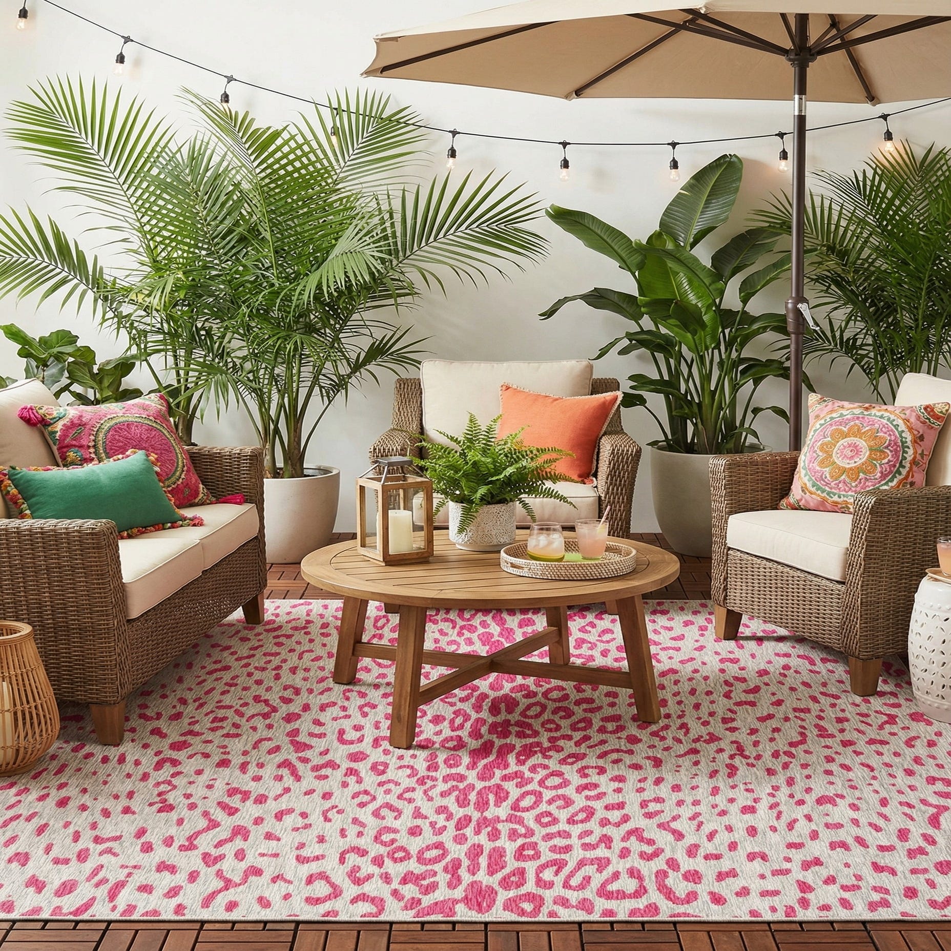 This Outdoor Safari rug features a dynamic animal print design. The pattern showcases a series of irregular spots reminiscent of a leopard's markings, rendered in a vivid hue set against a contrasting pink gray backdrop. A harmonious blend of contemporary and playful elements, the rug’s design introduces a touch of adventurous style to any space.