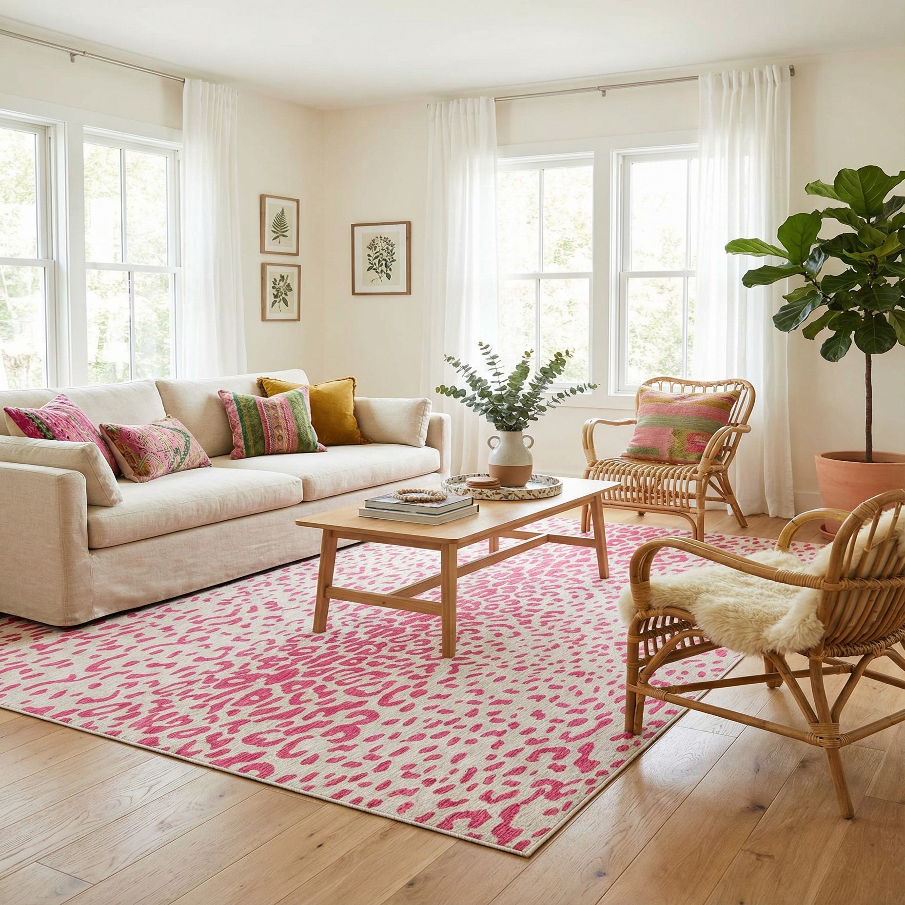 The Outdoor Safari Collection presents a 10x14 machine-woven rug constructed from 100% polypropylene, ensuring durability and ease of maintenance. This rug showcases a modern interpretation of an animal print pattern, with a predominant pink hue set against a subtle gray background, creating a visually impactful design. The flatweave construction offers a smooth texture that complements the stain-resistant and shed-free properties, making it an ideal choice for high-traffic areas and households with pets.