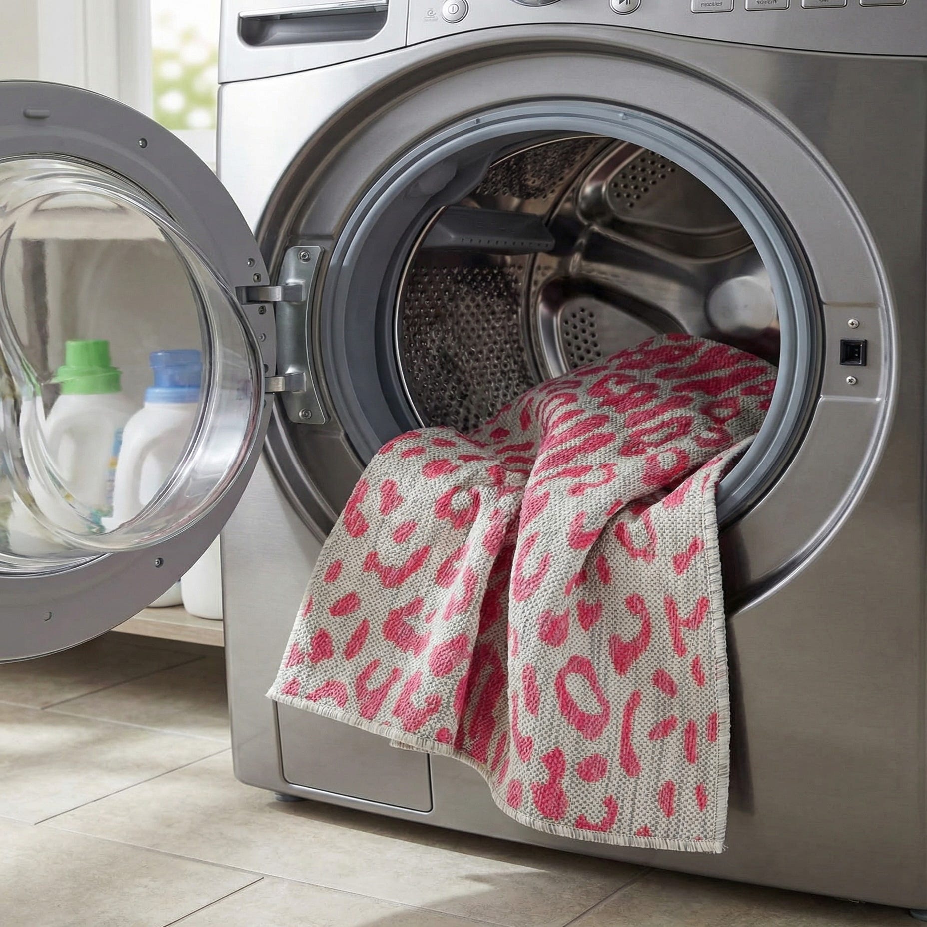 A 2x3 rectangular Rugs.com Outdoor Safari rug with a modern pink leopard print pattern on a gray background.