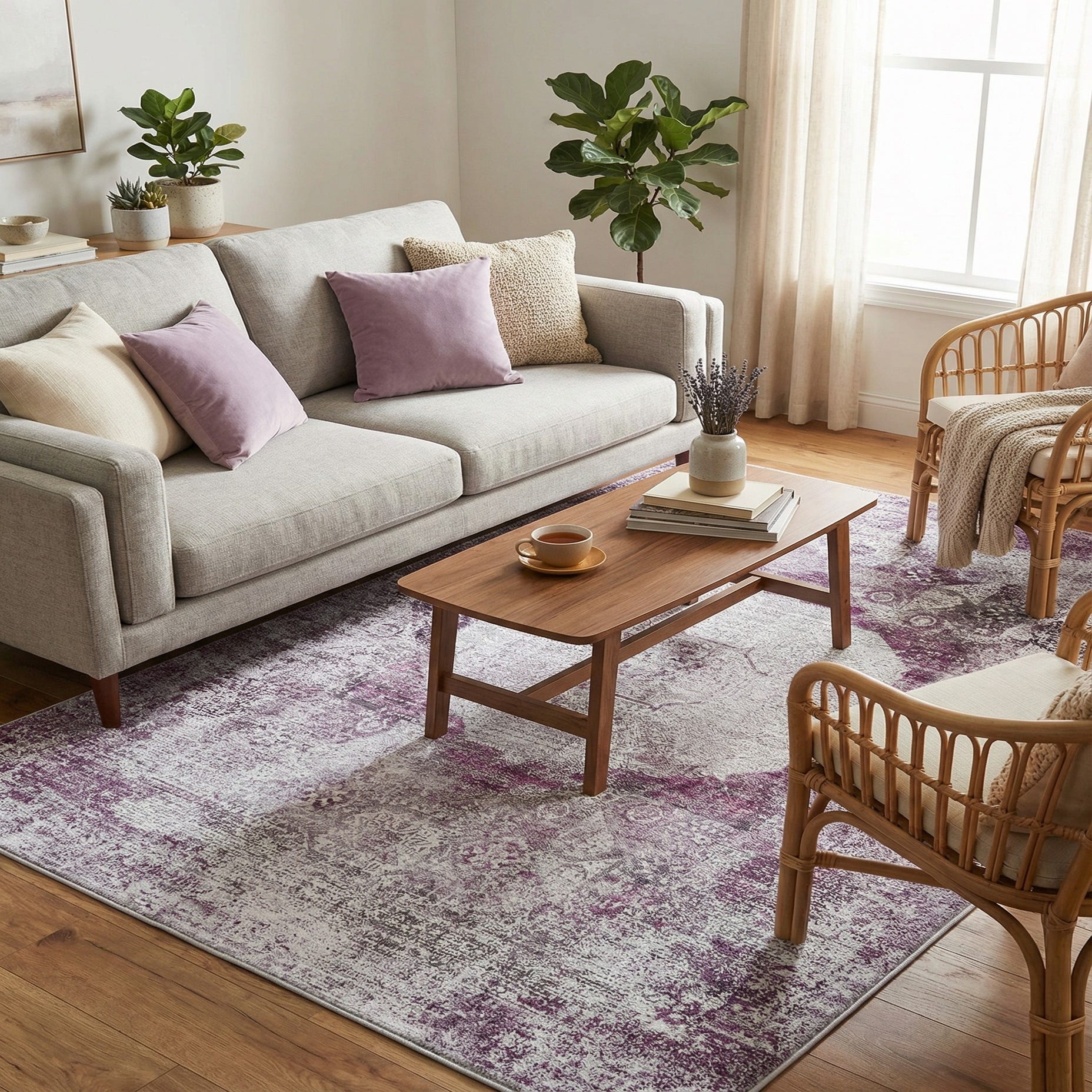 This rug works well where you want gentle color and pattern without dominating the room: place it under a bed to soften a neutral bedroom, anchor a seating area in a modern farmhouse or transitional living room, or add calm interest to a home office or reading nook. Pair it with pale wood furniture, soft gray upholstery, and muted metallic accents for a cohesive look, or layer textured throws and woven accessories to enhance the rug’s warm, lived-in character.