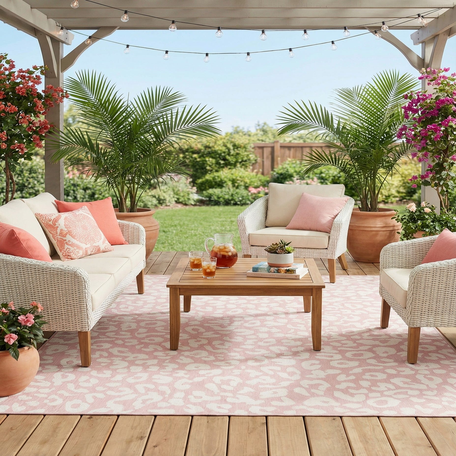 A 9x12 rectangular indoor/outdoor rug featuring a modern ivory and pink leopard print pattern, ideal for a patio or living room.
