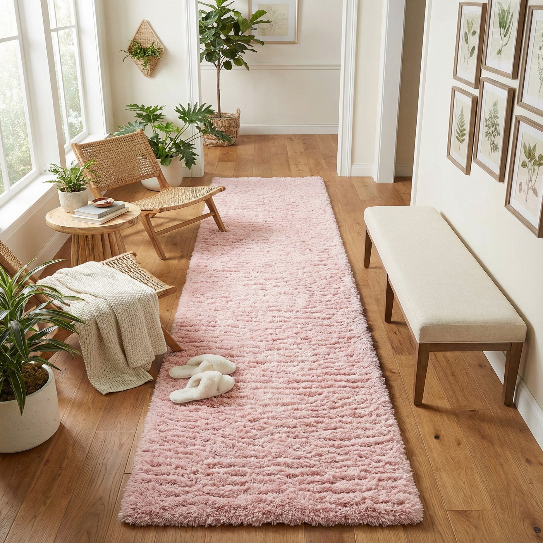 Designed as a runner, this piece works well in hallway and entryway layouts, alongside a bed, or as a soft pathway through a dressing area or nursery. It pairs easily with light woods and neutral linens for a Scandinavian or contemporary look, and with brass or mirrored accents for a modern-glam palette. For a layered, relaxed feel, place it over a natural fiber rug or mix with muted geometric textiles in a soft pastel scheme.