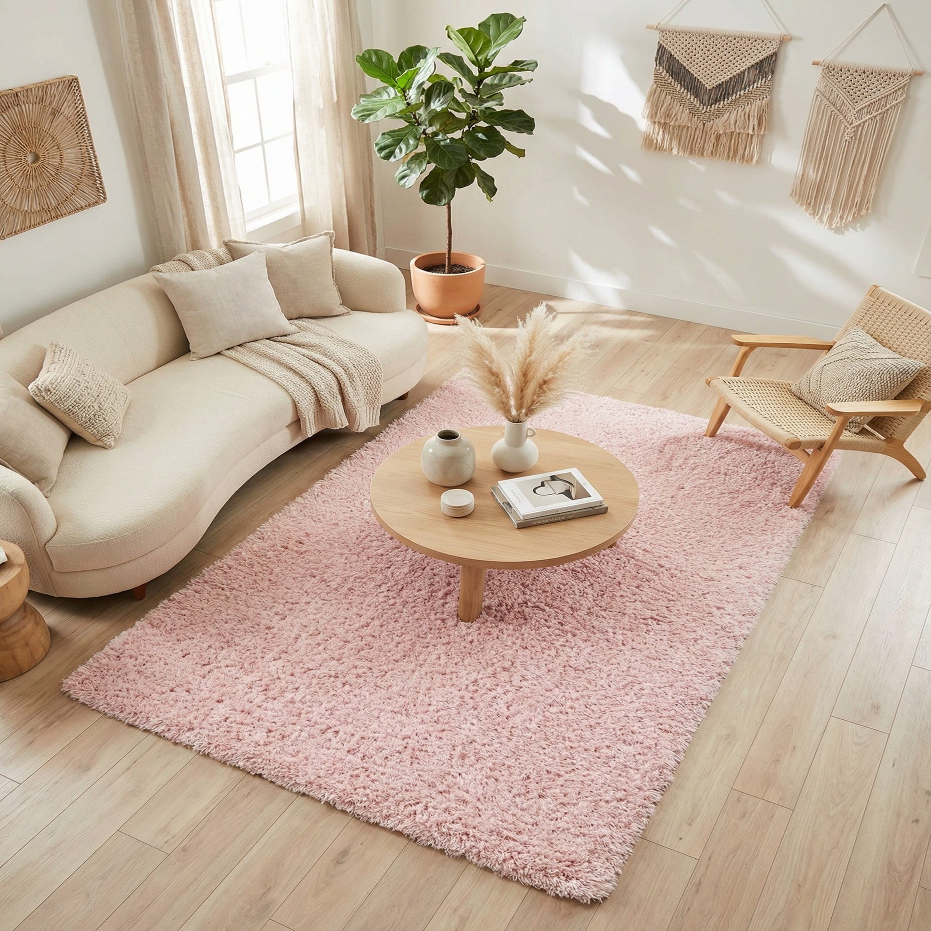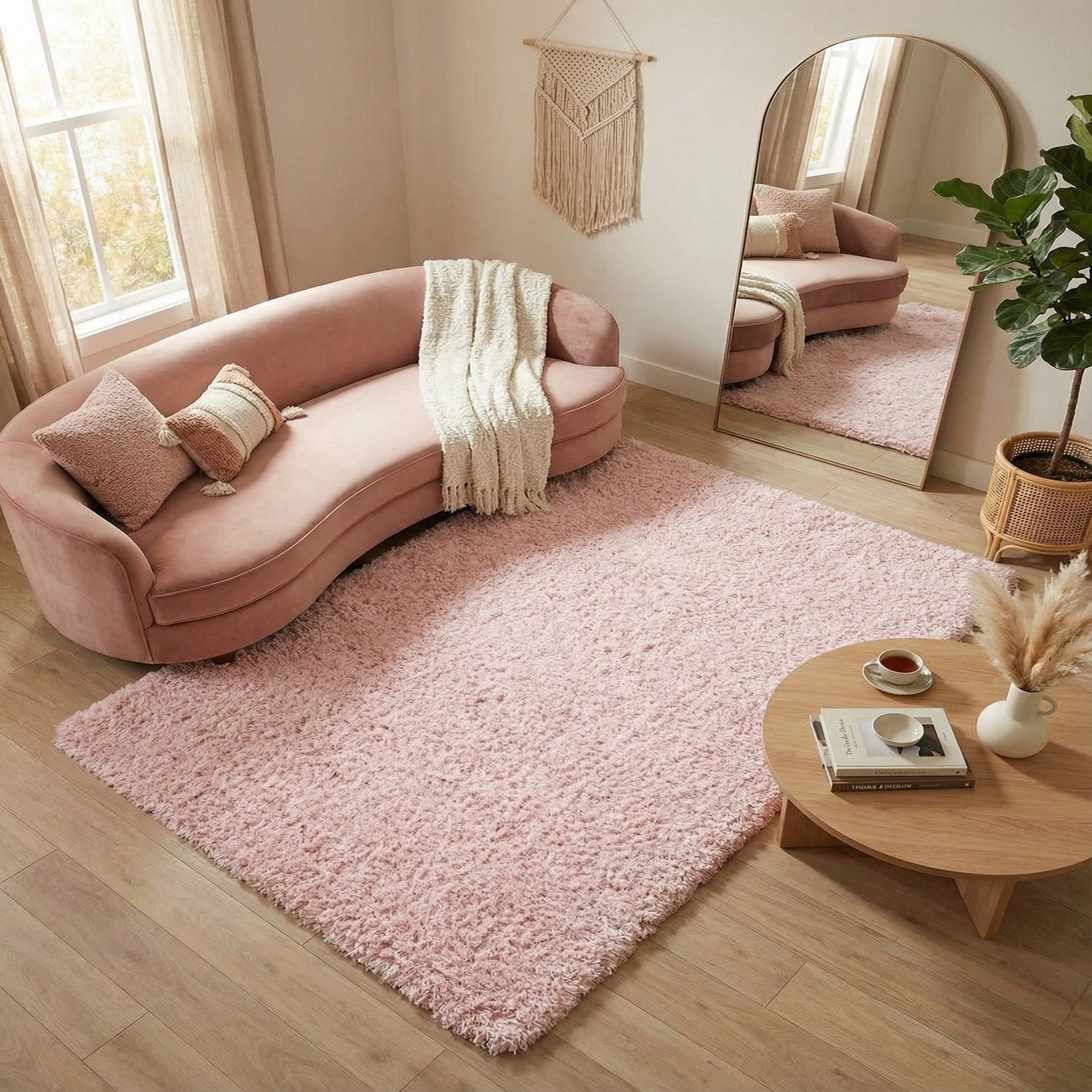 This rug fits naturally into a variety of interiors: layer it under a low coffee table to soften a contemporary living room, place it beside a bed for a gentle wake-up underfoot, or use it to warm a nursery or dressing area. It pairs well with light woods and neutral upholstery for a Scandinavian look, with brass or mirrored accents for a subtle glam vibe, or with rattan and textured throws in a relaxed boho setting.