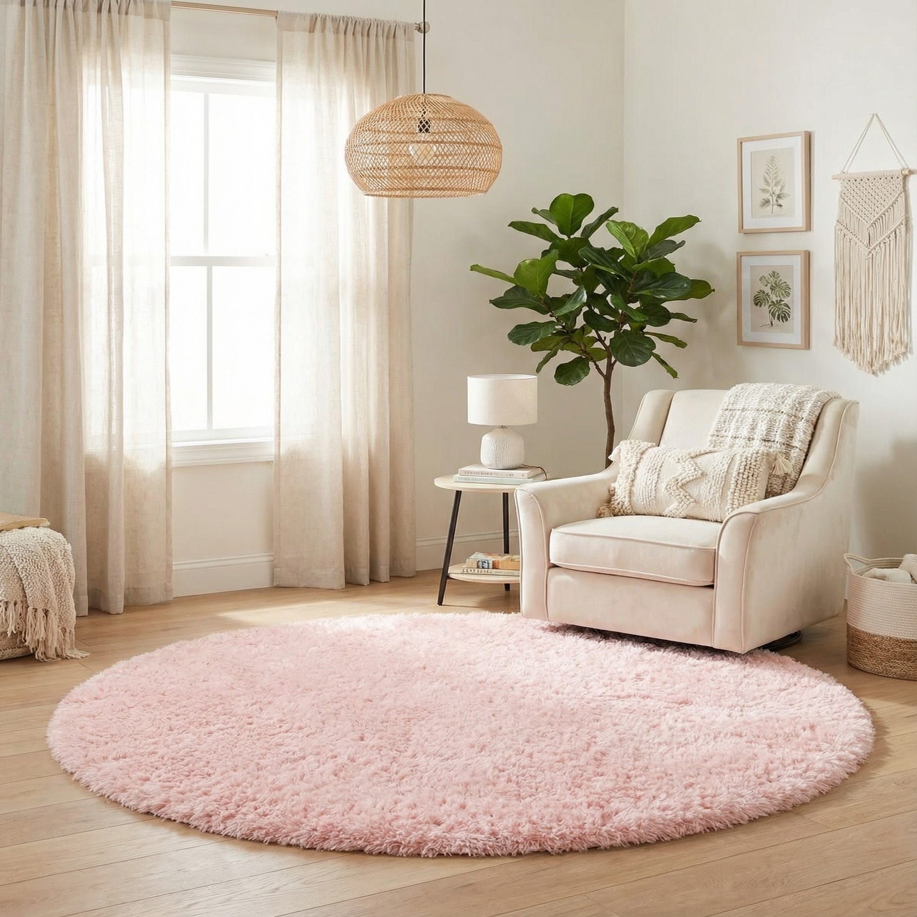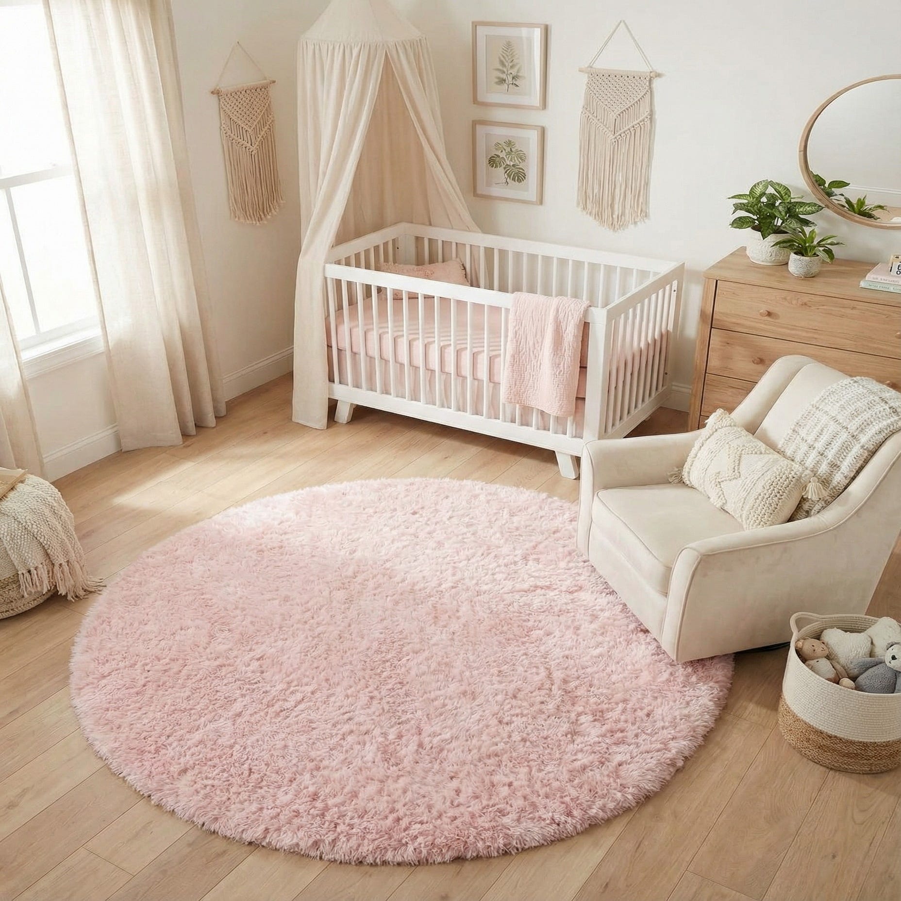 The simple color and round profile work well as a focal point in a nursery or a bedroom, or as a soft anchor beneath a reading nook or vanity. Pair it with light woods and white or soft gray furnishings for a Scandinavian or modern-luxe vibe, or layer it with textured throws and metallic accents to soften contemporary spaces.