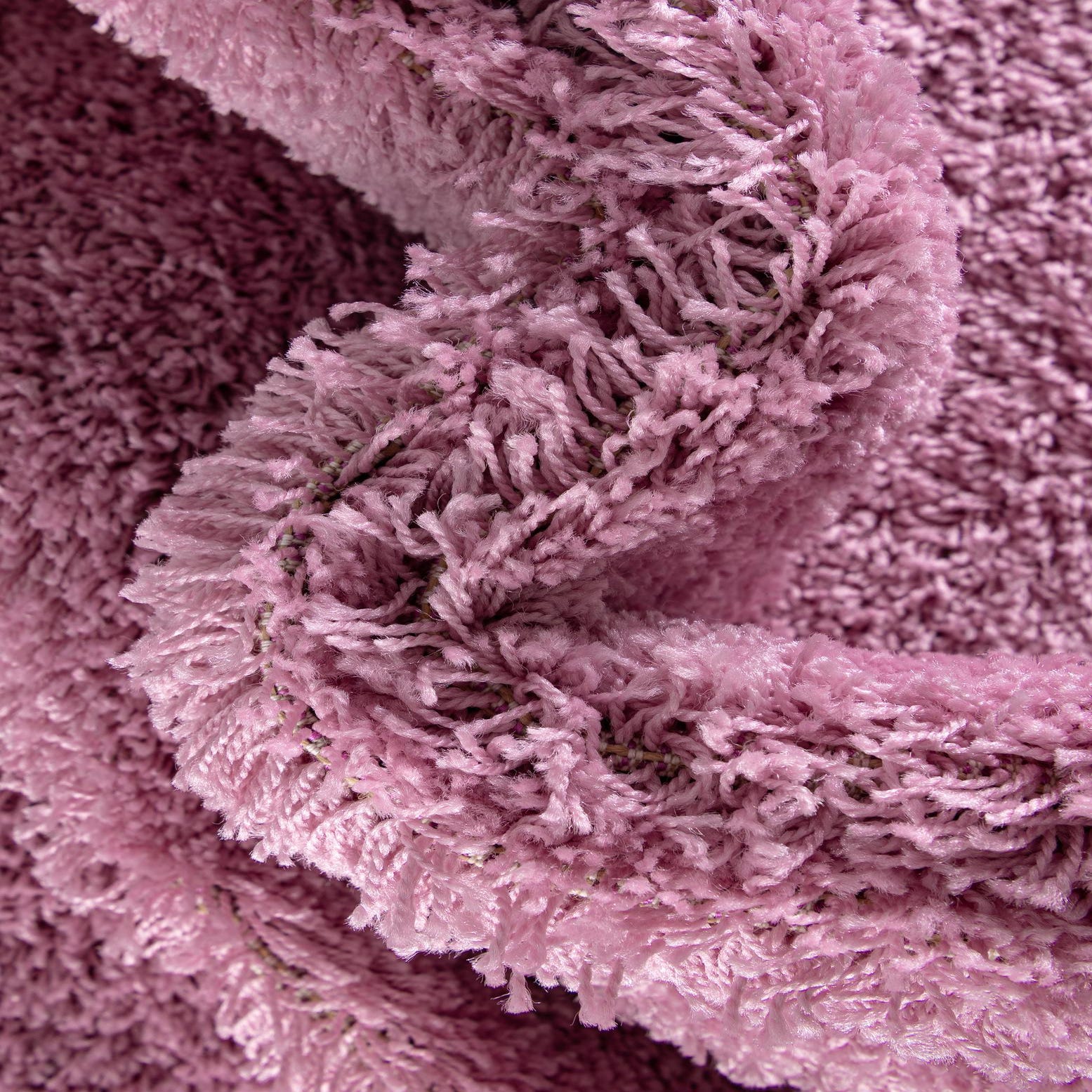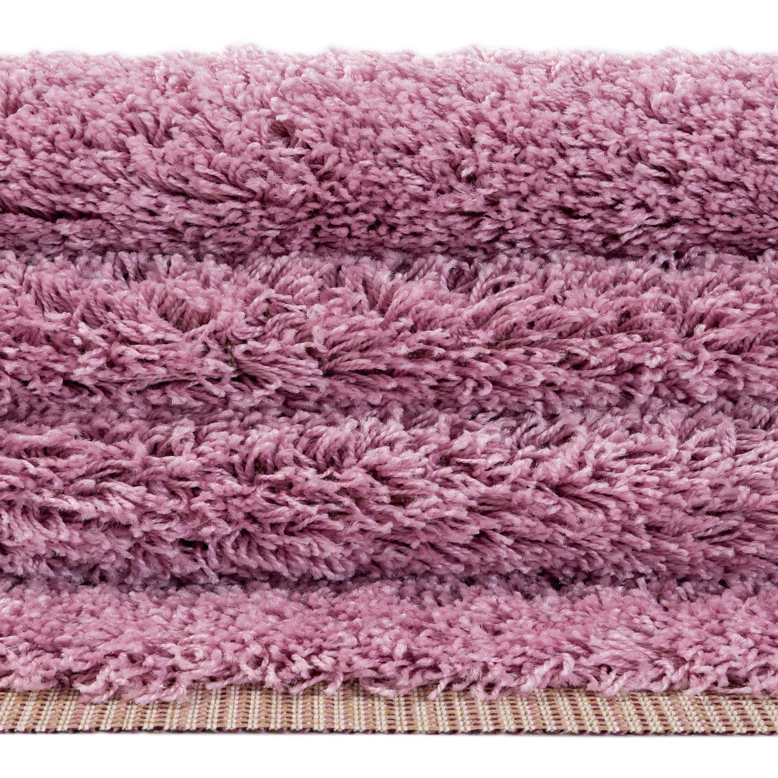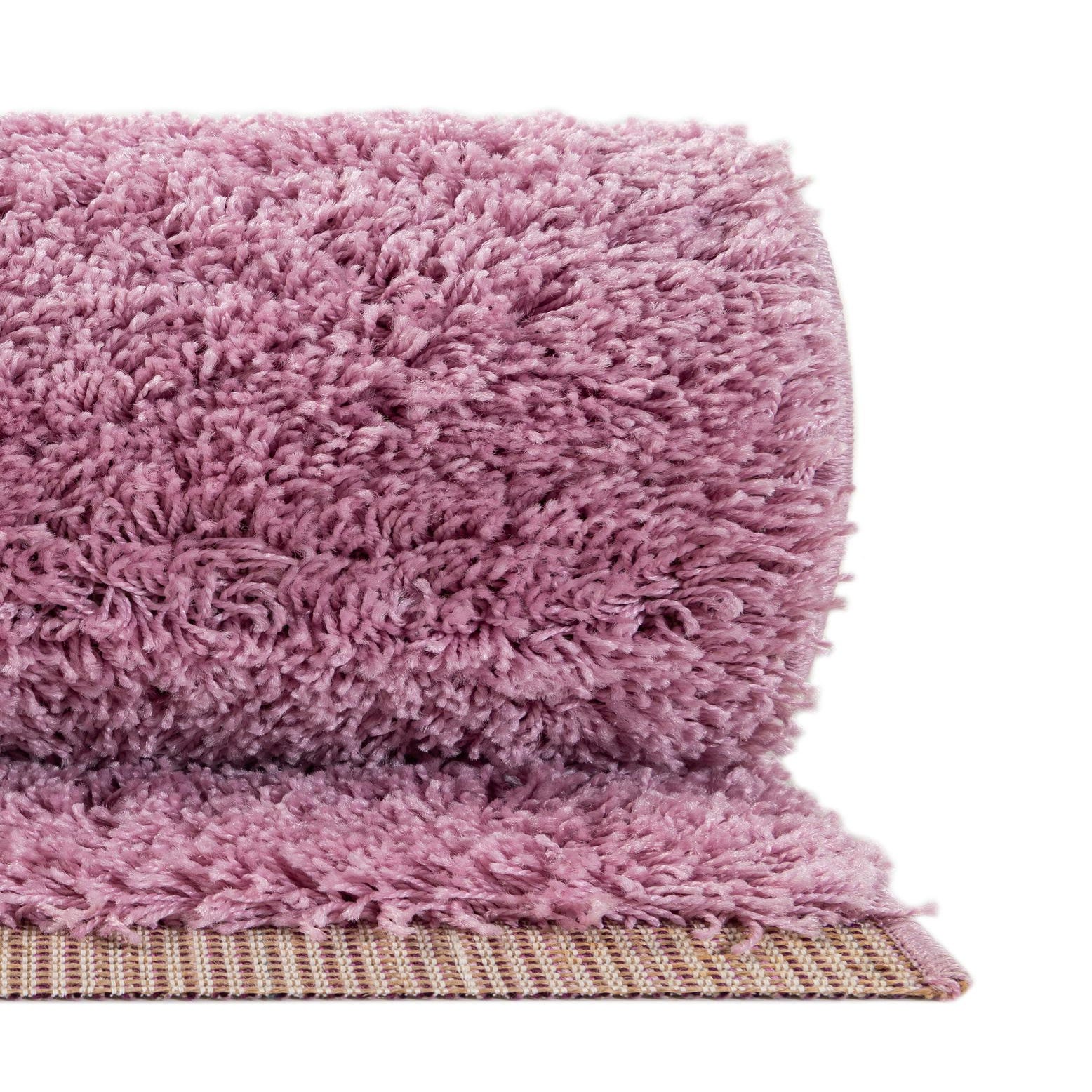 A soft, plush pink palace runner rug with a shag pile, perfect for adding warmth to a hallway.