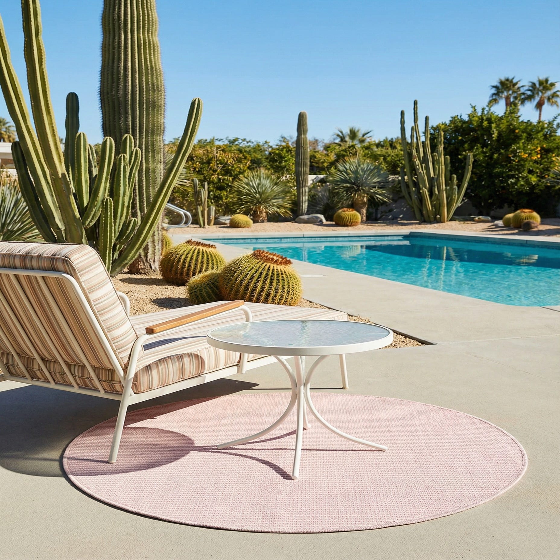 This piece works well on a covered patio or sunroom where its rosy tone can warm outdoor furniture, or inside a nursery or bedroom to add a calm, feminine touch without overpowering the room. It also pairs nicely with light wood floors, white or ivory linens, and woven or rattan furnishings for coastal, modern farmhouse, or relaxed boho schemes. Place it beneath a small seating group, beside a bed, or under a bistro table to introduce color and texture in a compact footprint.