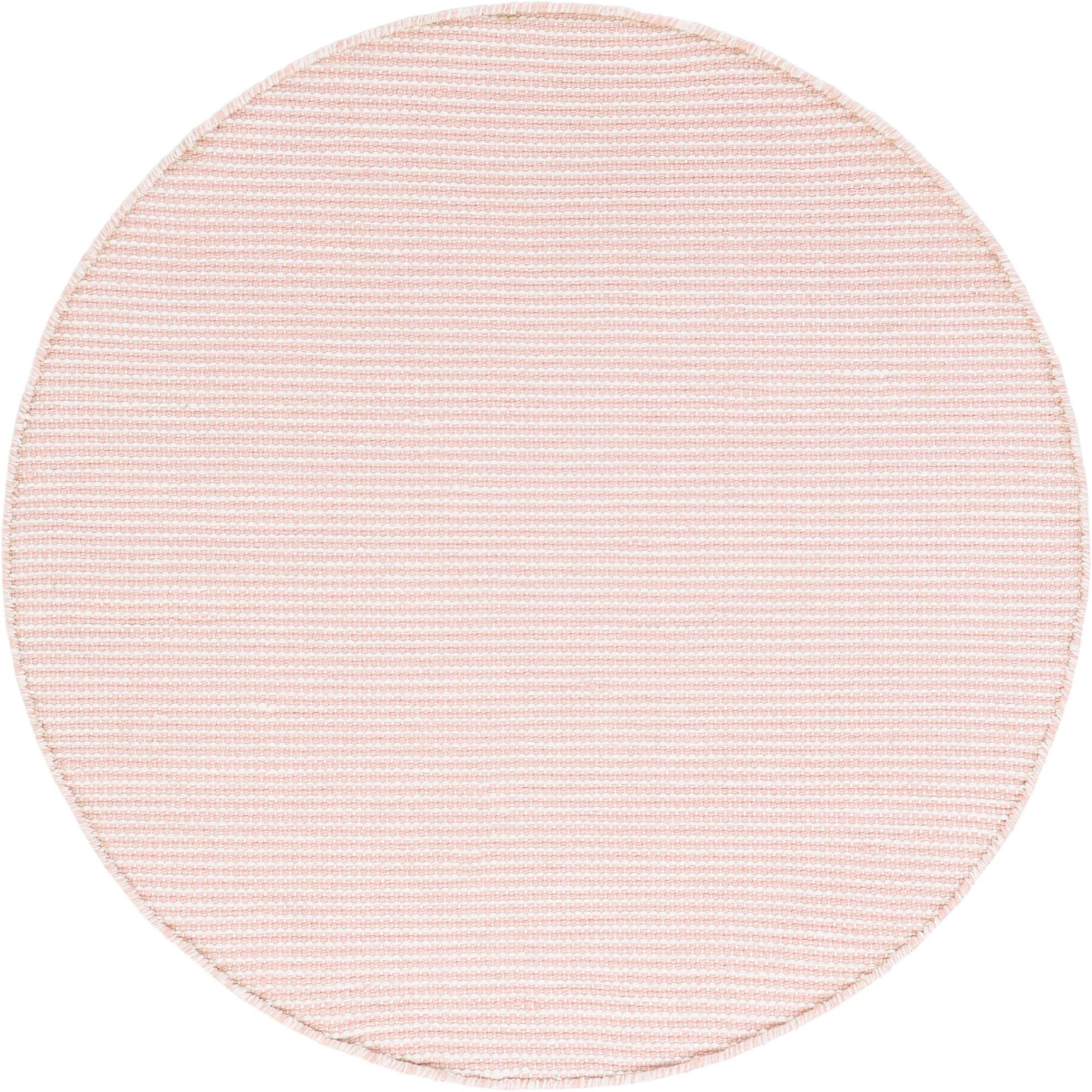 A soft banded pattern in a Pink Roses ground is woven with thin Ivory rows to create a subtle, linear texture across this round rug. The hand-made construction and flat, low-profile weave give it a tactile ribbed feel—smooth underfoot with gentle definition from the woven stripes. Made from 100% PET polyester (recycled plastic bottles), the fibers have a crisp finish that holds color well and reads as a refined, casual surface.