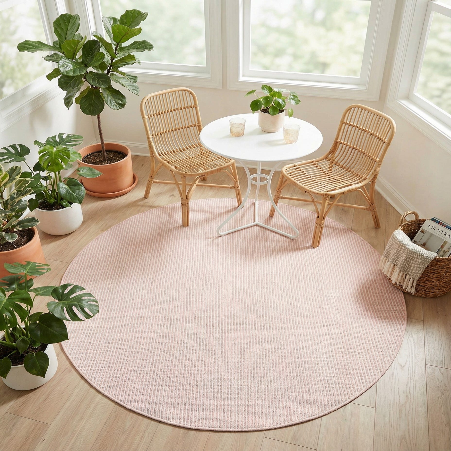 This round piece works well on a covered patio or balcony as a subtle foundation for rattan seating and striped cushions, and it also fits neatly under a small bistro table or in a sunlit breakfast nook. In interiors, pair it with white-painted wood, soft linens, and botanical accents for a light, cottage-inspired palette, or use it in a modern coastal scheme alongside natural textures and muted metallics for a softer, more relaxed focal point.