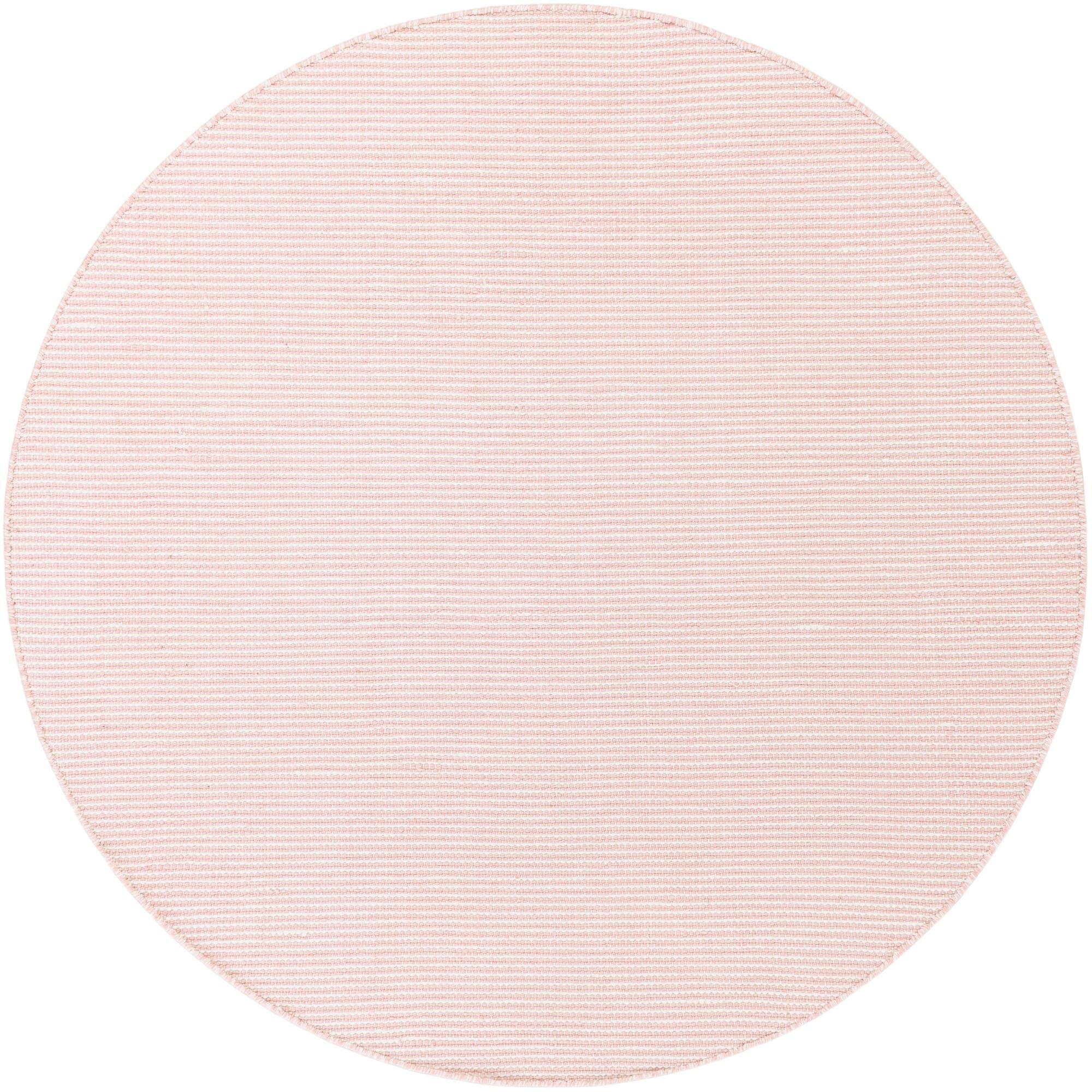 A 5' 1 round pink roses flatweave rug with a subtle textured pattern, suitable for indoor or outdoor use.