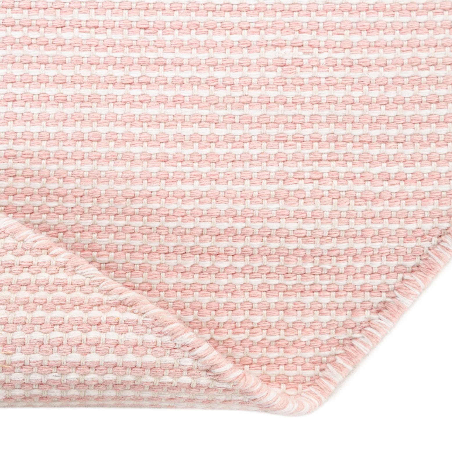 A soft, sunlit Pink Roses background is threaded with fine Ivory ribbing to create a calm, understated pattern that reads as clean and contemporary. The surface is flat and low-profile with gentle horizontal ribs you can feel underfoot, giving the rug a tactile, woven quality rather than a plush pile. Hand made of 100% PET Polyester (Recycled Plastic Bottles), the construction balances a refined textile look with the practical feel of an outdoor-friendly weave.