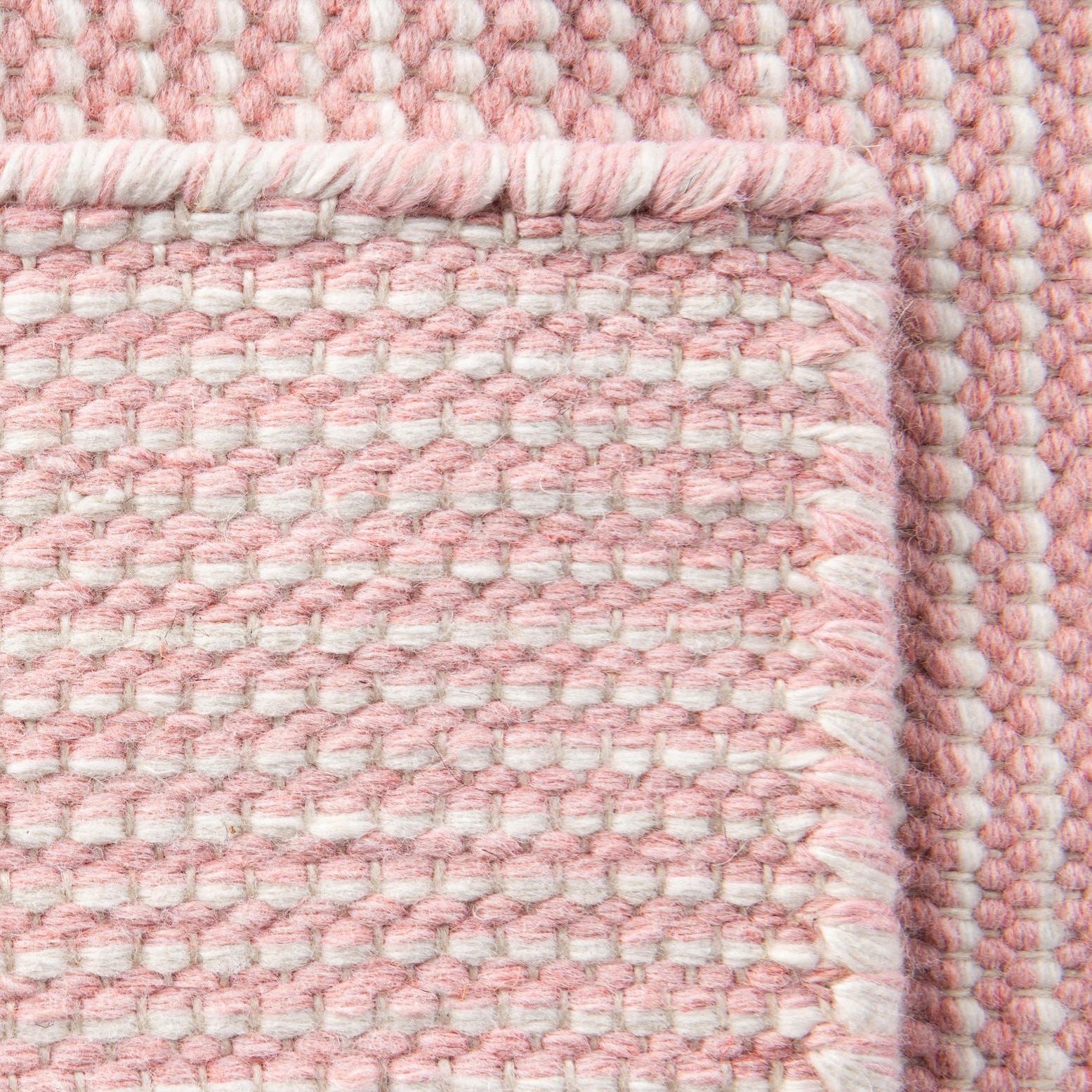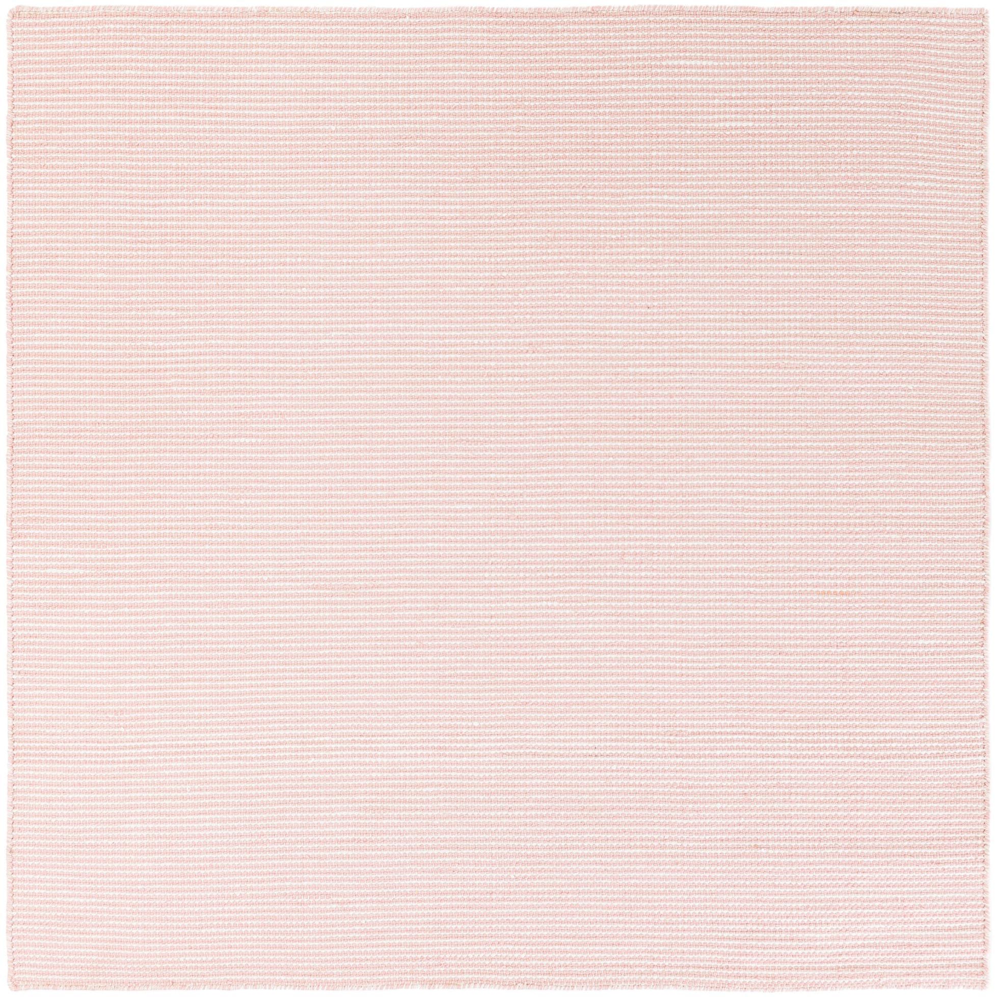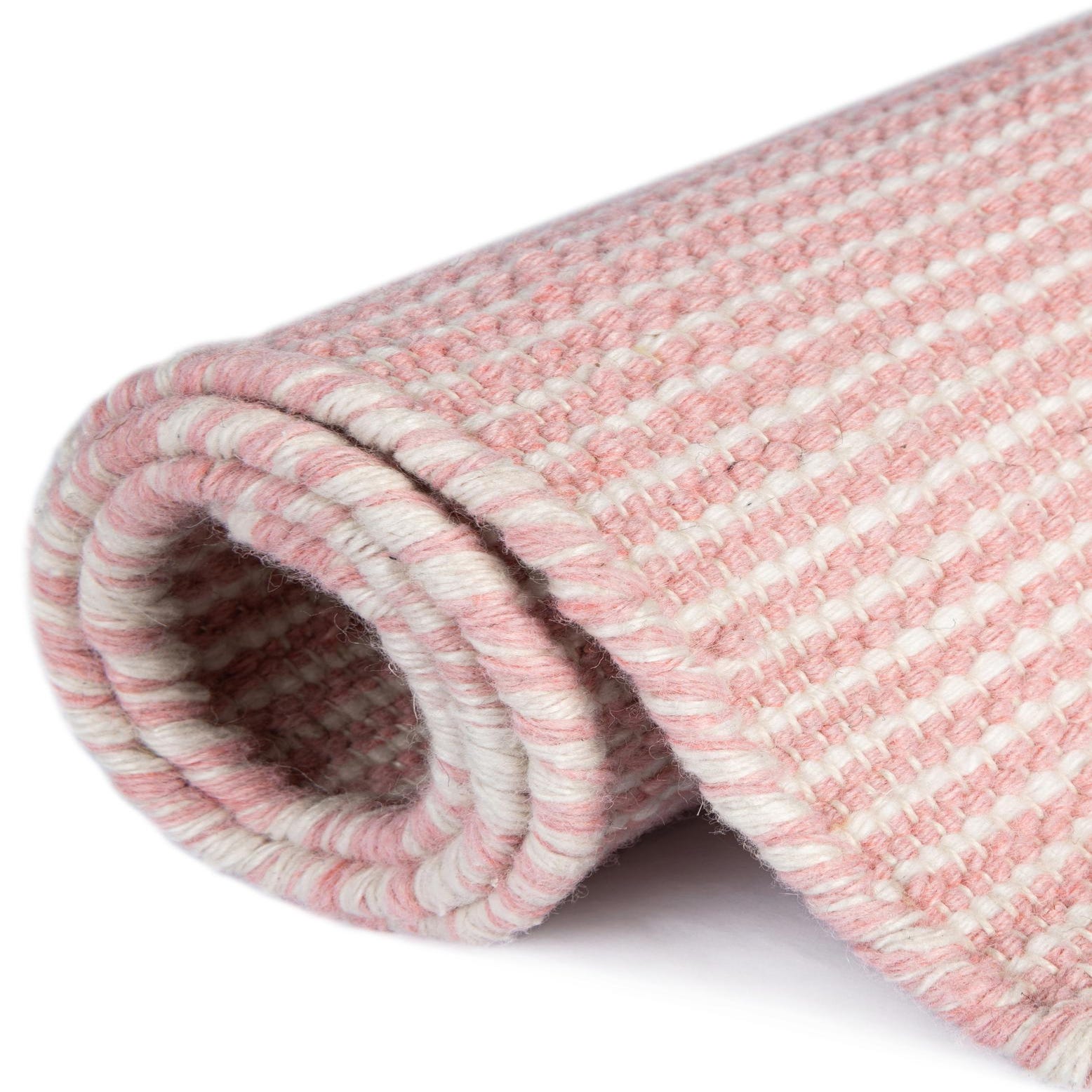 Soft Pink Roses forms a calm, single-tone field punctuated by a fine horizontal ribbed weave. The pattern is understated—narrow, evenly spaced ribs create a subtle linear texture that reads clean and contemporary. Hand made of 100% PET polyester (recycled plastic bottles), the yarn is tightly woven into a low-profile flatweave that feels smooth underfoot while showing the gentle definition of each rib when you brush your hand across it.