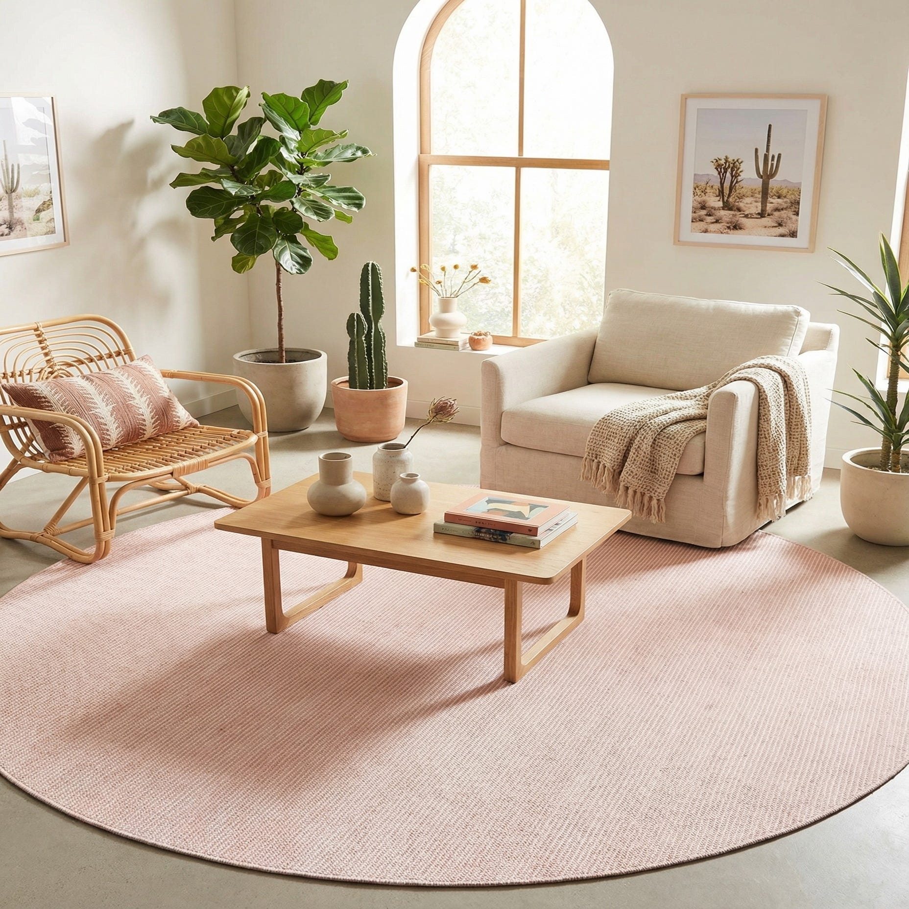 Ideal for covered patios, sunrooms, or a bright breakfast nook, this rug anchors a round table or a small seating arrangement without competing with other elements. It pairs nicely with coastal and modern-minimal interiors—think light woods, woven accents, and soft neutrals—and complements a feminine bedroom or nursery when layered with natural textures and pale linens. Because it balances a gentle color with a simple, tactile weave, it’s an easy piece to incorporate into both indoor and sheltered outdoor living areas.