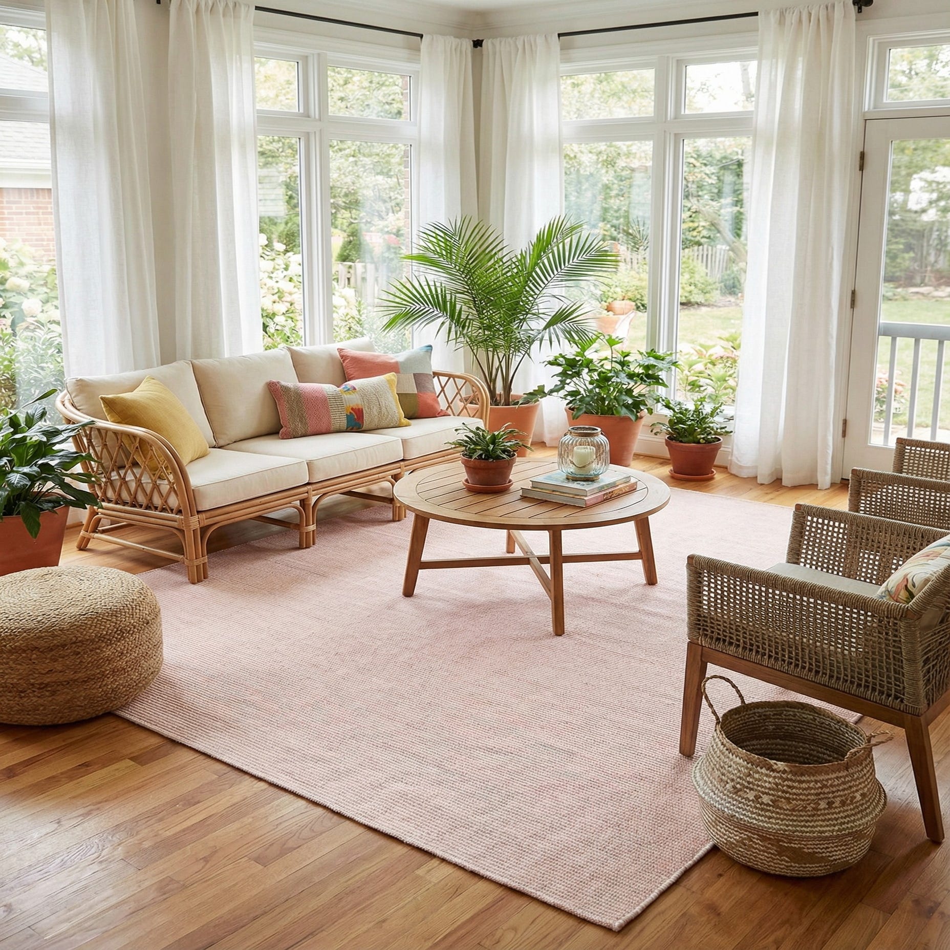The surface feels structured and slightly textured underfoot, offering a tactile, low-pile finish that works well in both indoor and covered outdoor settings. Pair it with a white linen sofa and brass accents for a soft, modern living room; layer it under rattan seating on a screened porch for a relaxed coastal vibe; or place it in a nursery or bedroom to introduce a gentle, warm color while keeping the overall look simple and sophisticated.