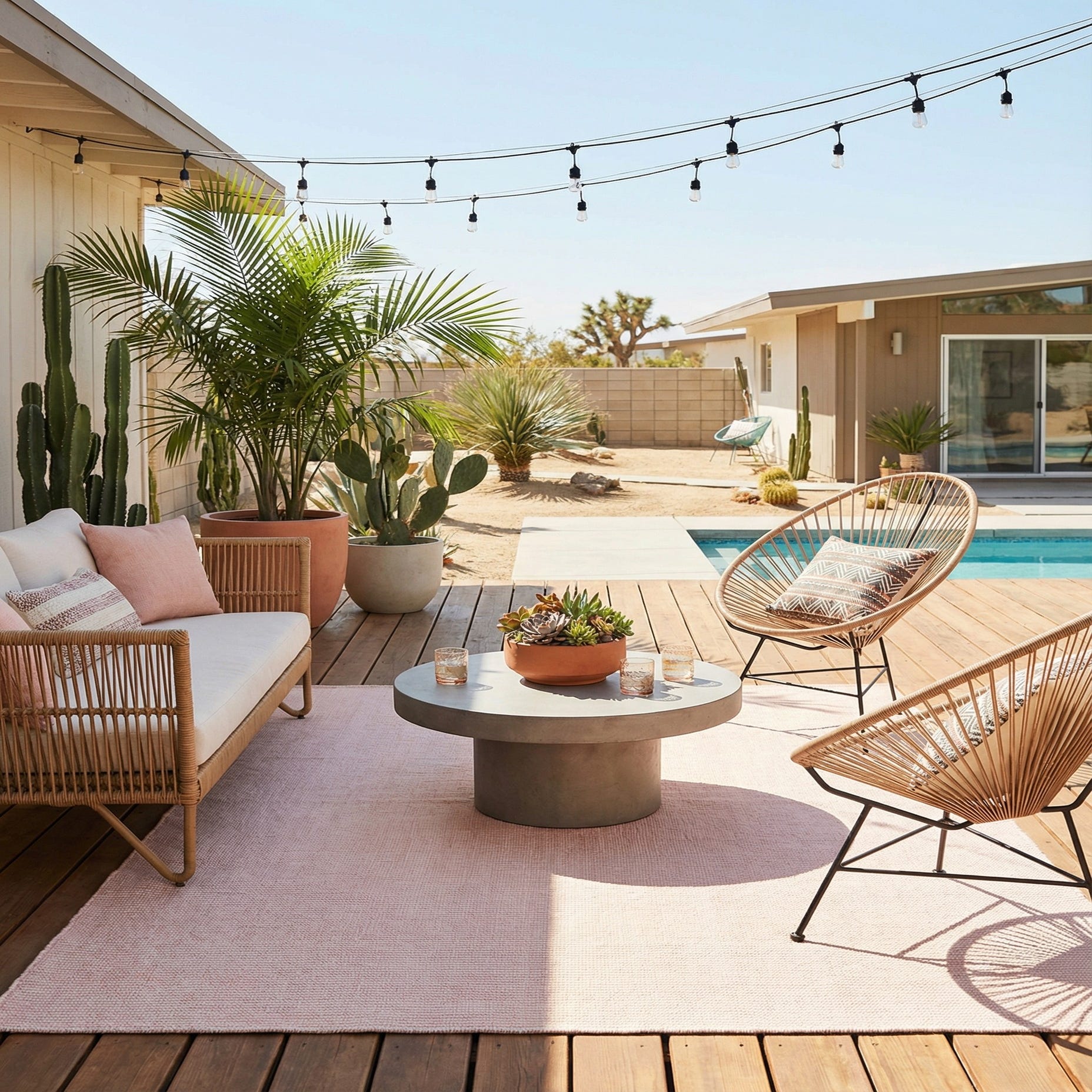A large 8x10 rectangular Jill Zarin Palm Springs Outdoor rug in a soft Pink Roses color, featuring a subtle textured flatweave.