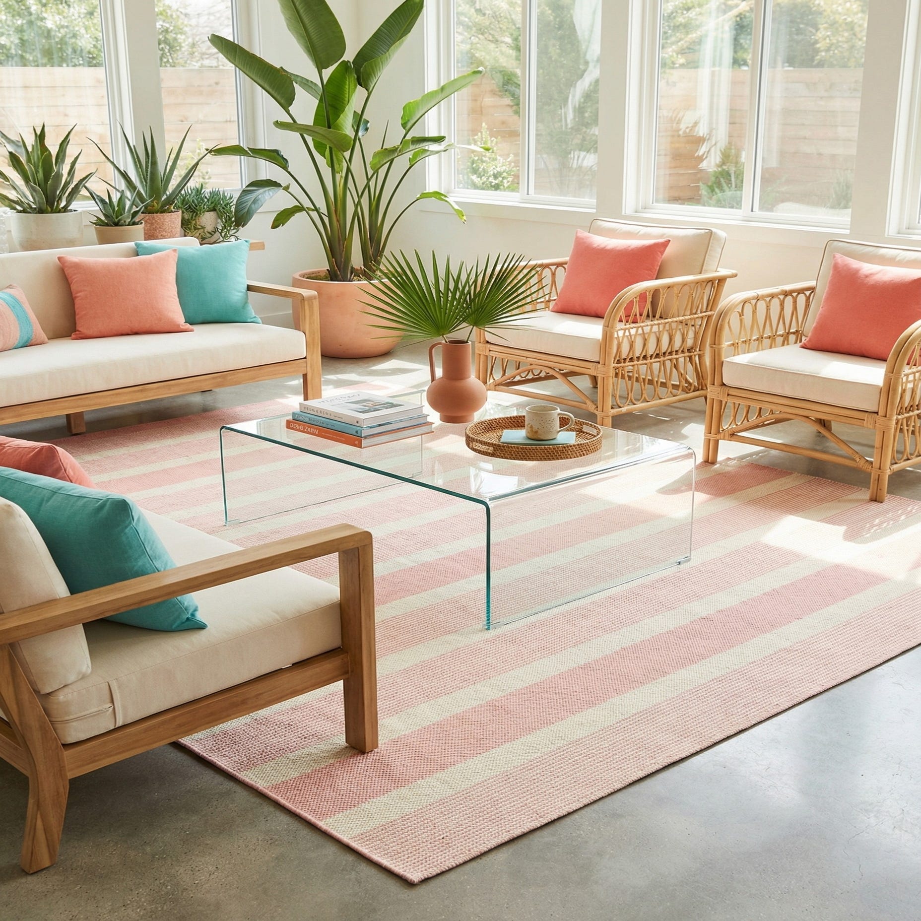 A 9x12 rectangular Jill Zarin Palm Springs area rug in a soft Pink Roses color with a subtle textured flatweave, suitable for indoor or outdoor use.