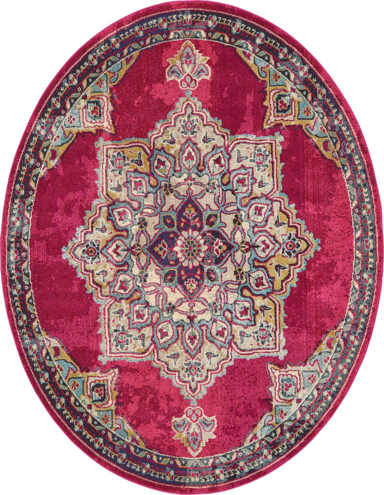 Primary color is Pink. Colors in this rug include: Pink, Beige, Gold, Light Green, Navy Blue, Puce, Violet.