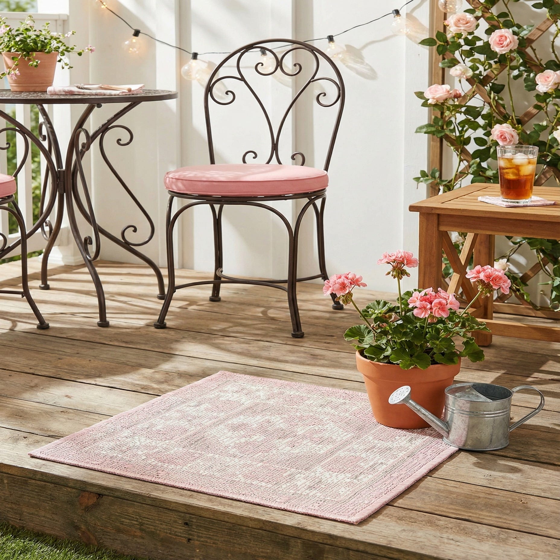 Machine made of 100% polypropylene, this sample has a low-profile, flatwoven texture you can feel beneath your feet — a firm, slightly nubby weave with visible stitch detail that lies flat in high-traffic areas. Pair it with white or natural wood furnishings on a covered patio or sunroom to enhance a cottage or coastal scheme, tuck it under a neutral sofa in a living room to introduce a soft color layer, or place it in a feminine bedroom or nursery alongside ivory and gray textiles for a calm, coordinated look.
