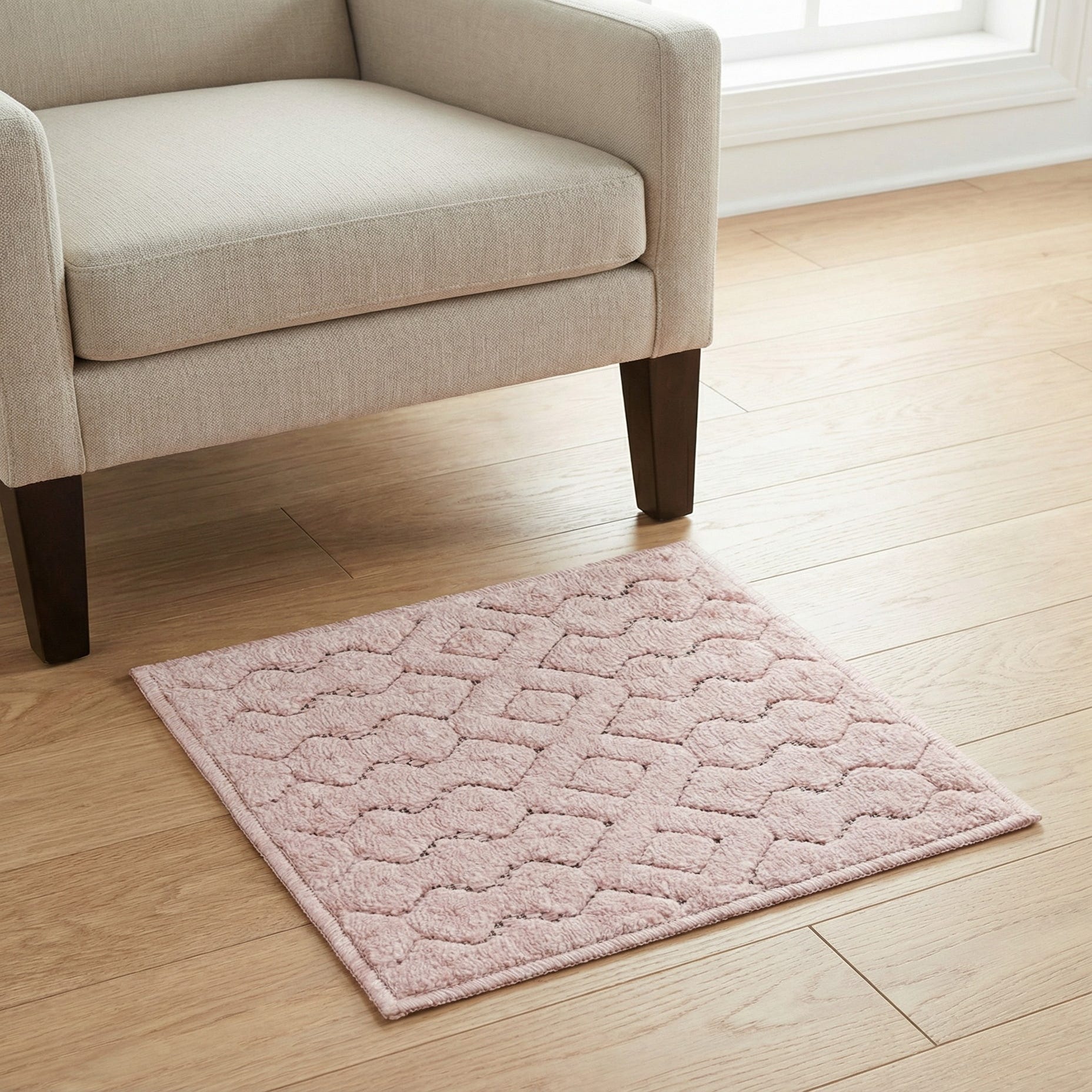 Soft pink sets a gentle, modern backdrop for a raised trellis motif that plays with geometry and texture. Diamond shapes run down the center while scalloped, interlocking wave rows march across the field, the raised pile creating a plush, sculpted surface that contrasts with lower, neutral-toned outlines. Machine-made from polypropylene, the rug has a soft hand underfoot with a structured, textured finish. This piece is a Sample.