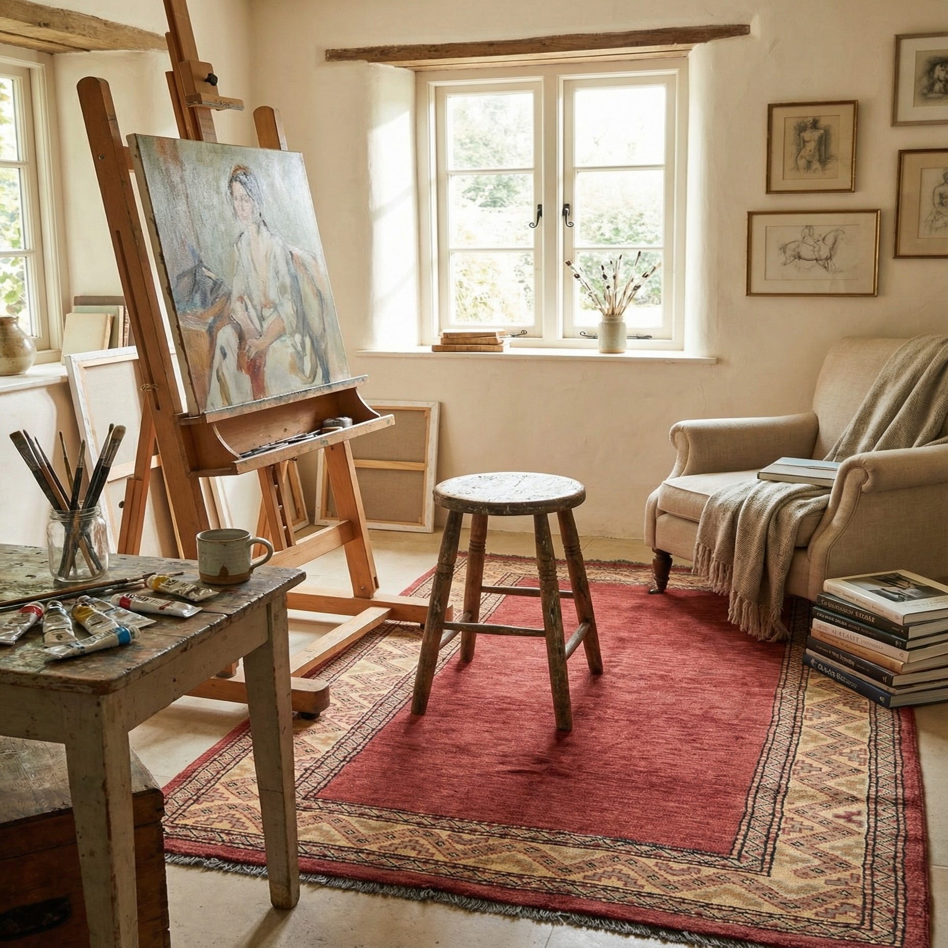 This rug works well as an anchor in a small seating area or beneath a narrow console in an entryway, and it layers nicely at the foot of a bed or along a hallway. Its palette and pattern suit a range of interiors—from warm, mid-century or transitional rooms with wood tones and leather, to eclectic or global-inspired spaces where the border pattern can complement patterned textiles and textured accents. Pair with neutral upholstery and brass or black metal details to bring out the border’s contrast, or add soft beiges and ivories to emphasize the rug’s lighter hues.