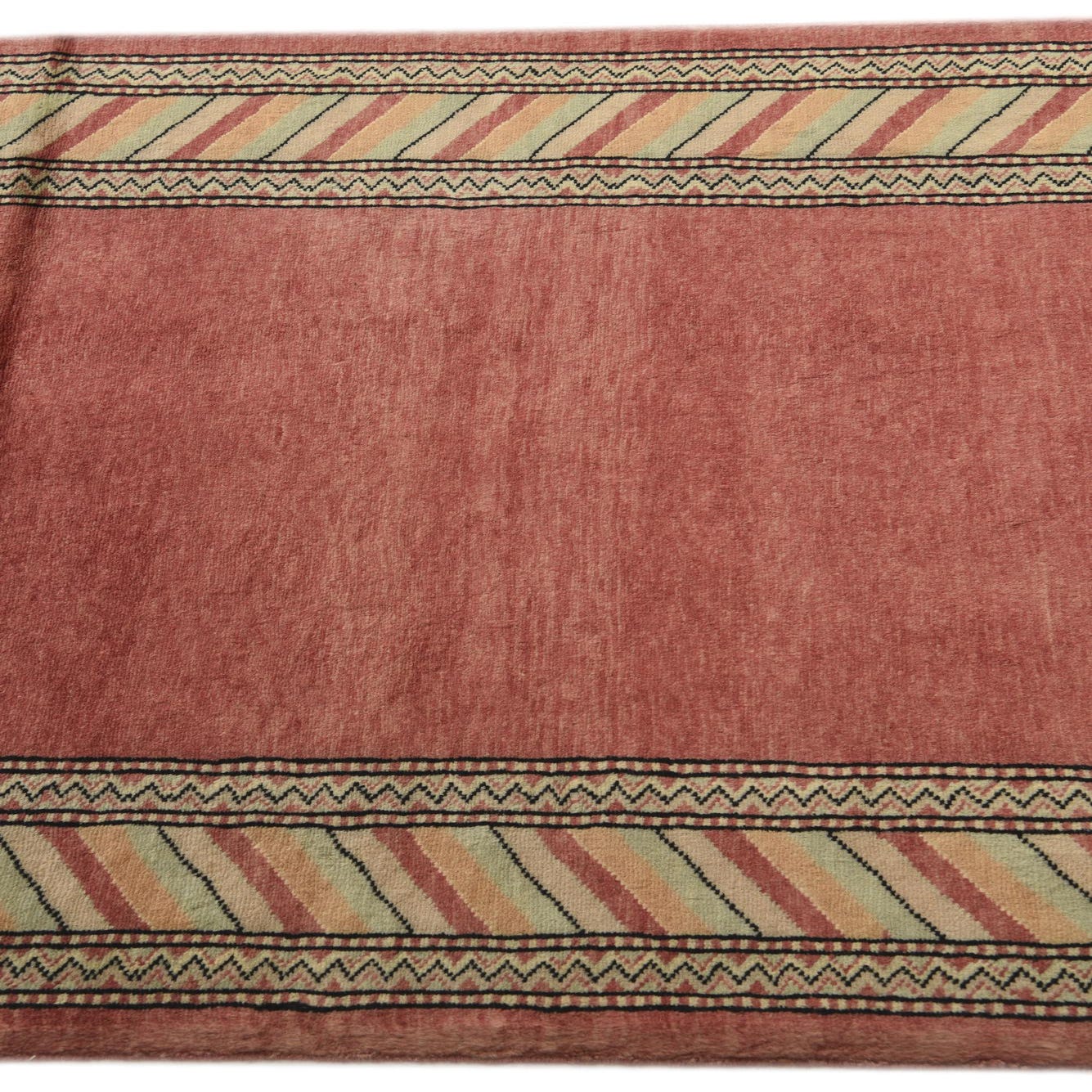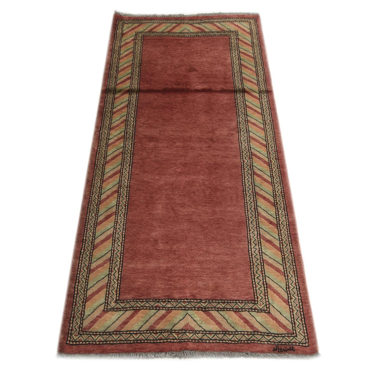 The Kashkuli Gabbeh rug features a plush texture, hand knotted from 100% wool, offering both durability and comfort underfoot. Measuring 3x5, this rug is characterized by its deep plum red background, providing a warm and inviting base color that anchors the design. A geometric border incorporating colors of black, light green, and gold, adds subtle intricacy and visual interest. The addition of fringe on either end lends a traditional touch to the rug's overall aesthetic.