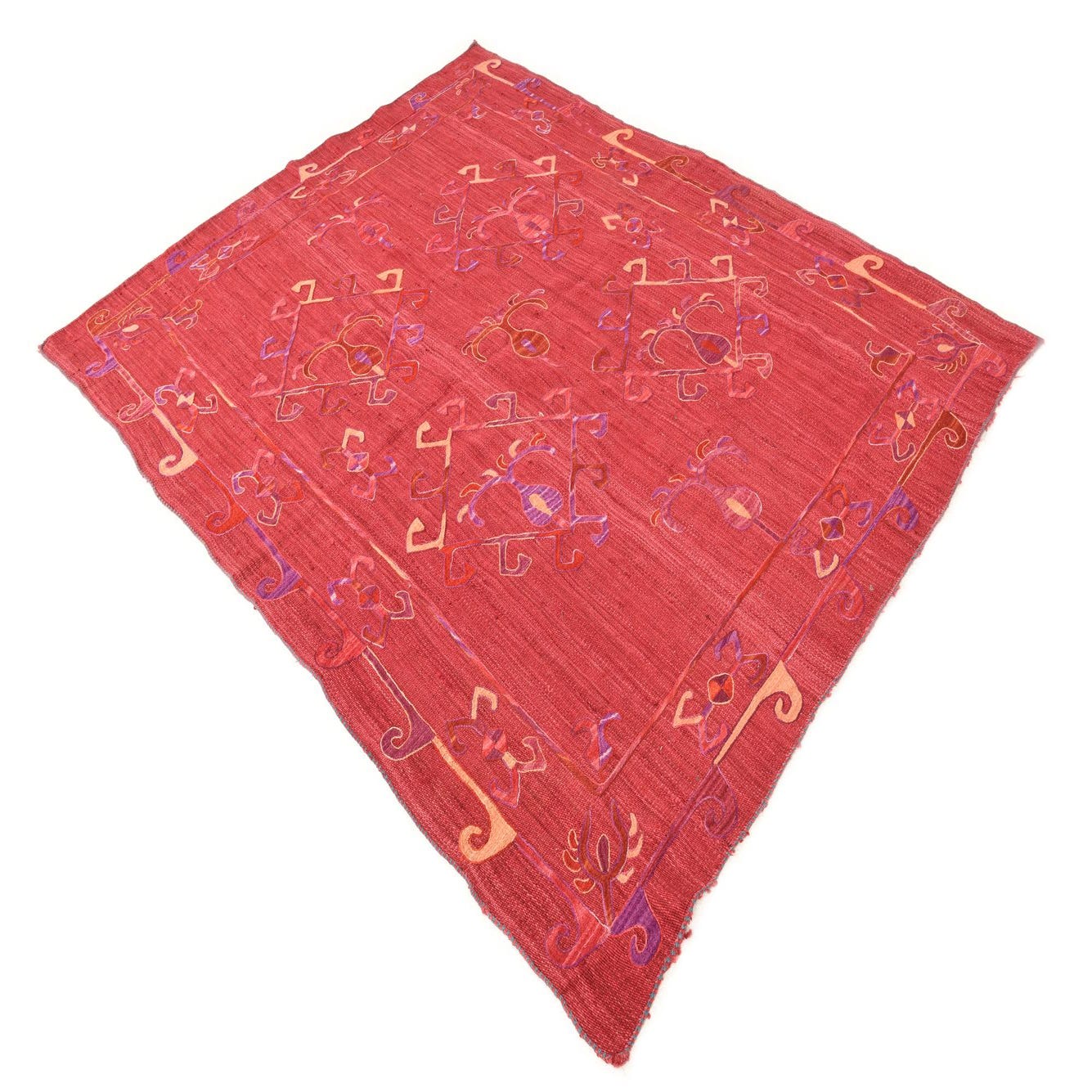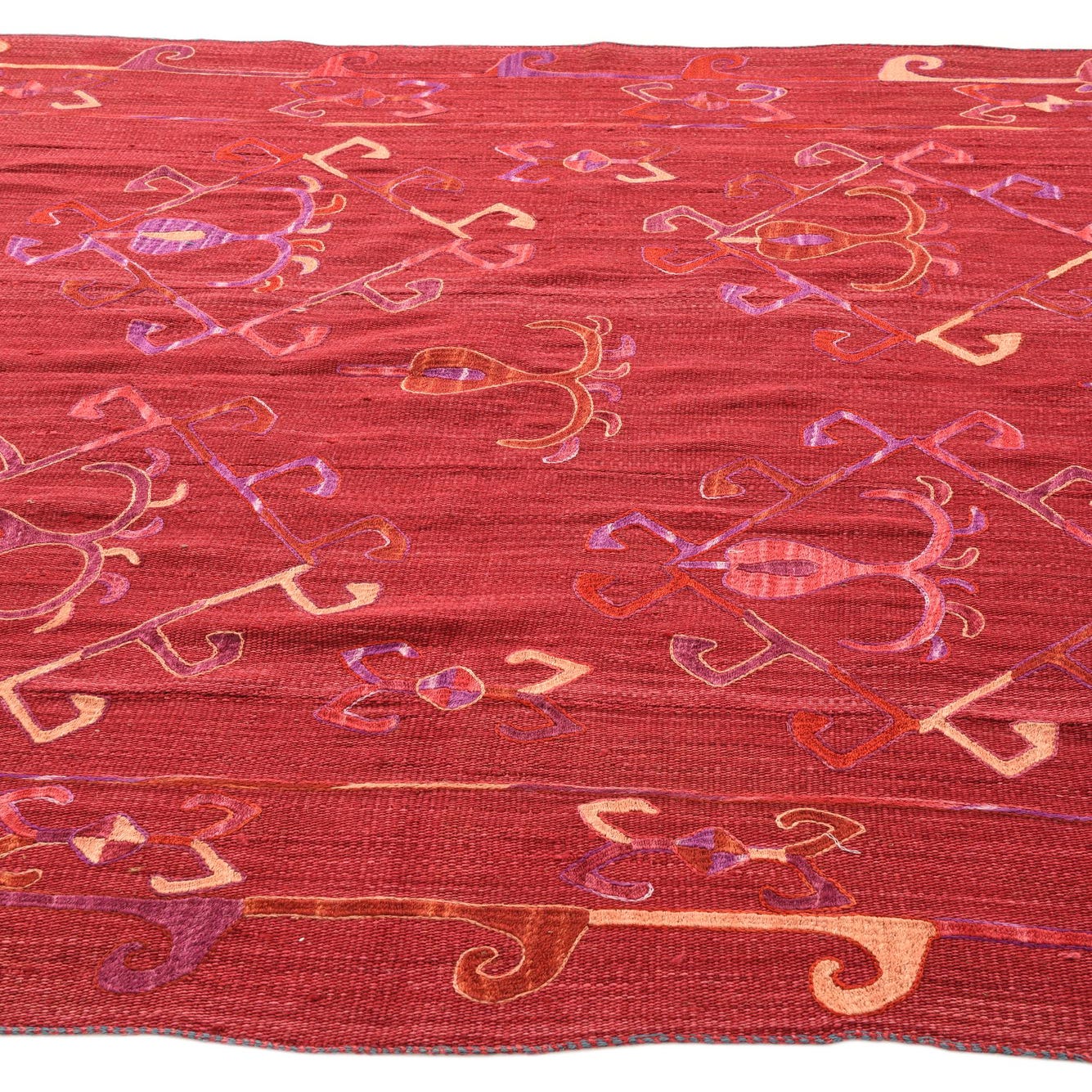 A 5x8 rectangular Kilim Suzani rug featuring a vibrant red background with intricate tribal and abstract patterns in shades of purple, red, and orange.